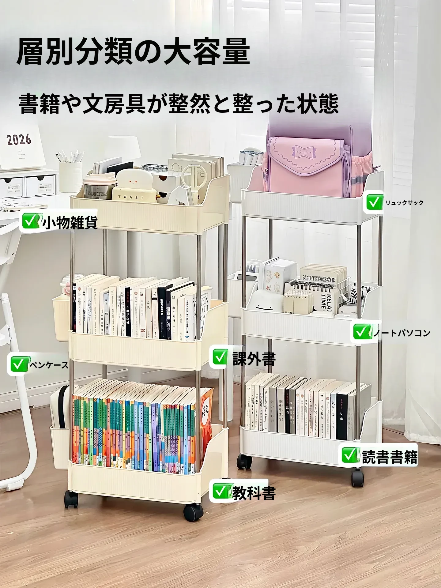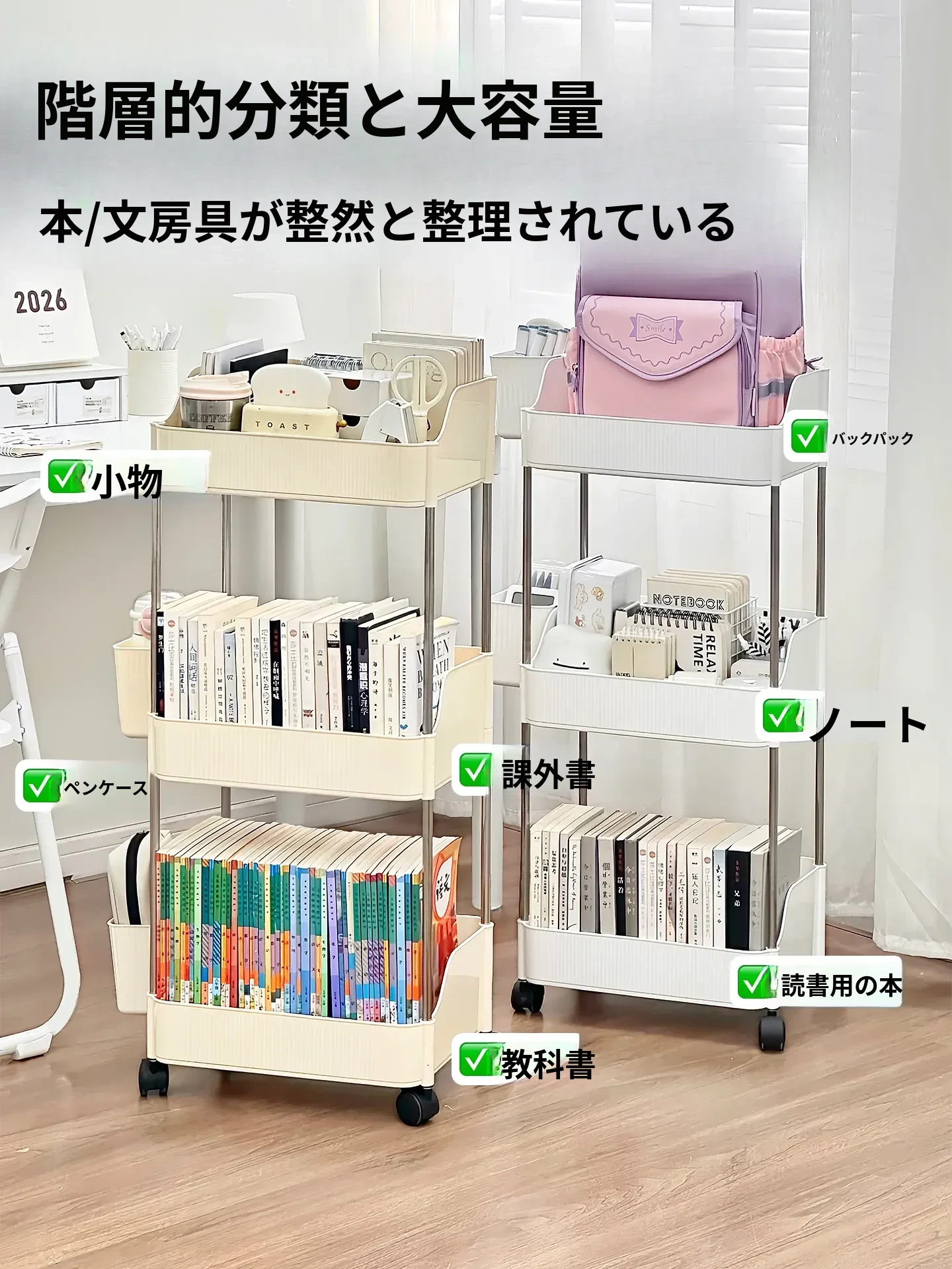 キャスター付きの学生用書類収納ラック - 移動可能で大容量、多段階の本棚!デスク下にぴったりフィットし、文具や書籍をすっきり整理。学習環境を整えて、効率的な勉強をサポートします!
