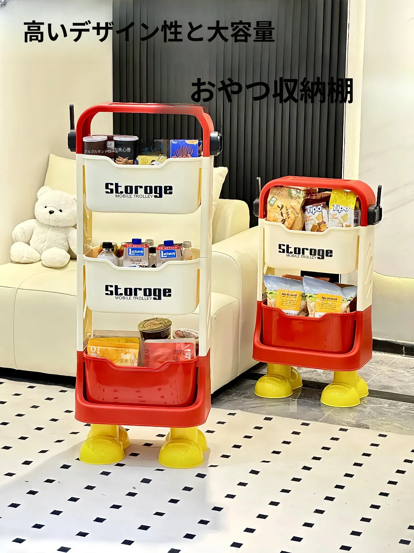 おしゃれで便利!キャスター付きの多段収納お菓子ラック - リビングに最適な可動式小物整理キャビネット、おもちゃや雑貨もスッキリ収納!