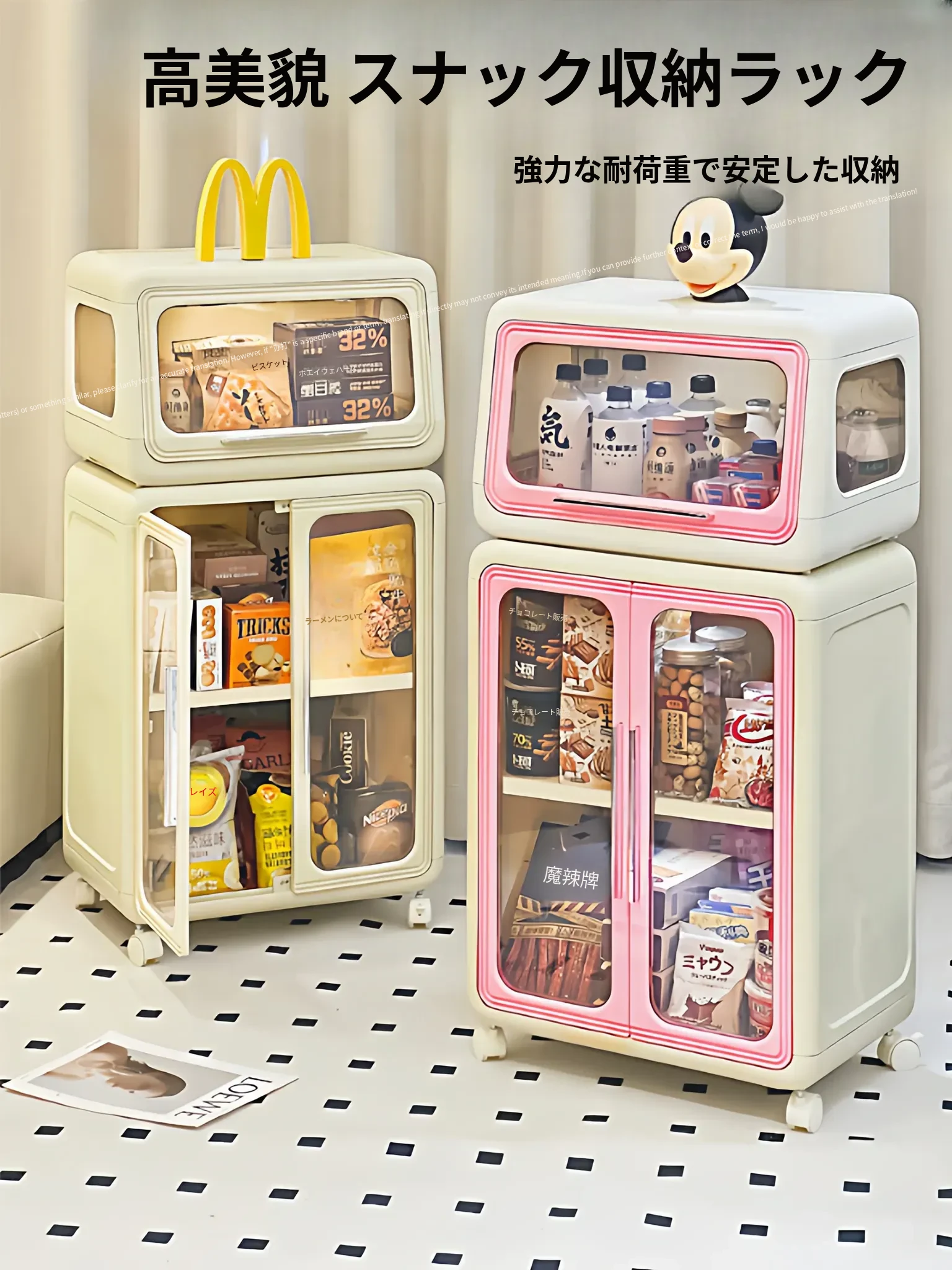 おしゃれで高機能なスナック収納ラック!移動可能な小型キャスター付き、リビングやおもちゃの整理に最適な多段収納キャビネット。生活空間をスッキリ美しく演出します!