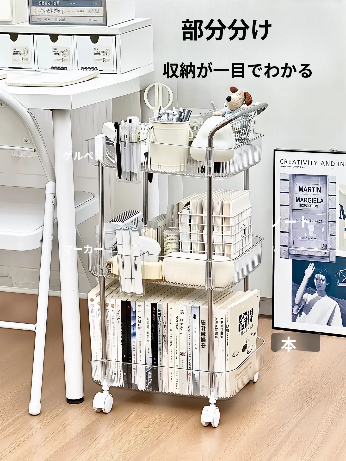 子供向けの多層ブックシェルフ - 学習机のそばにぴったり!移動可能な収納カートで絵本や教科書をすっきり整理。お部屋を美しく保ち、学ぶ楽しさをサポートします!