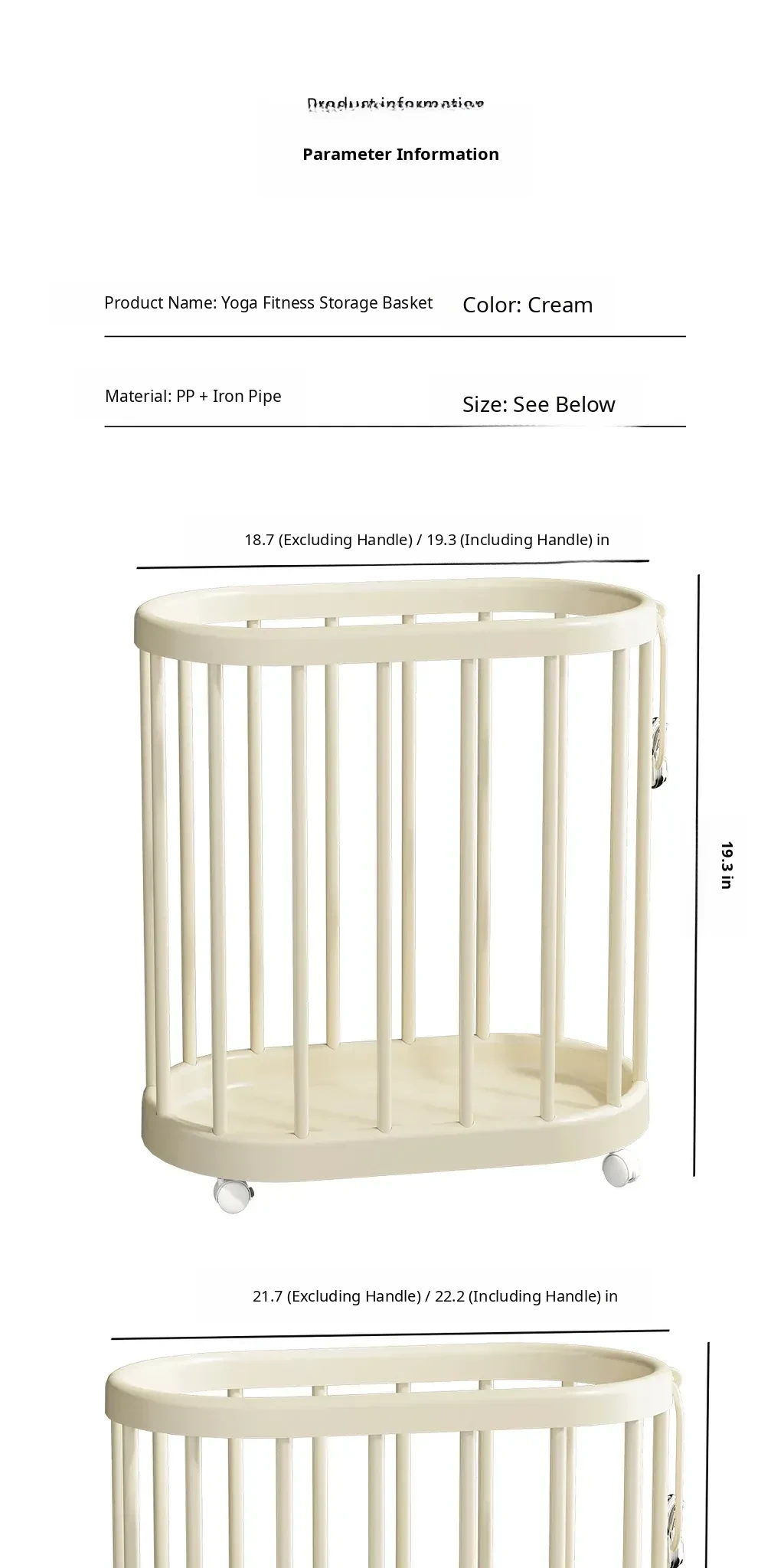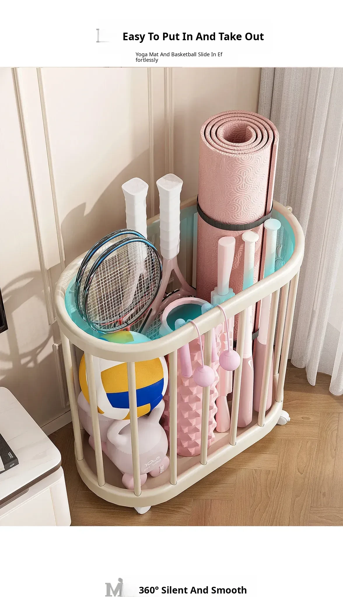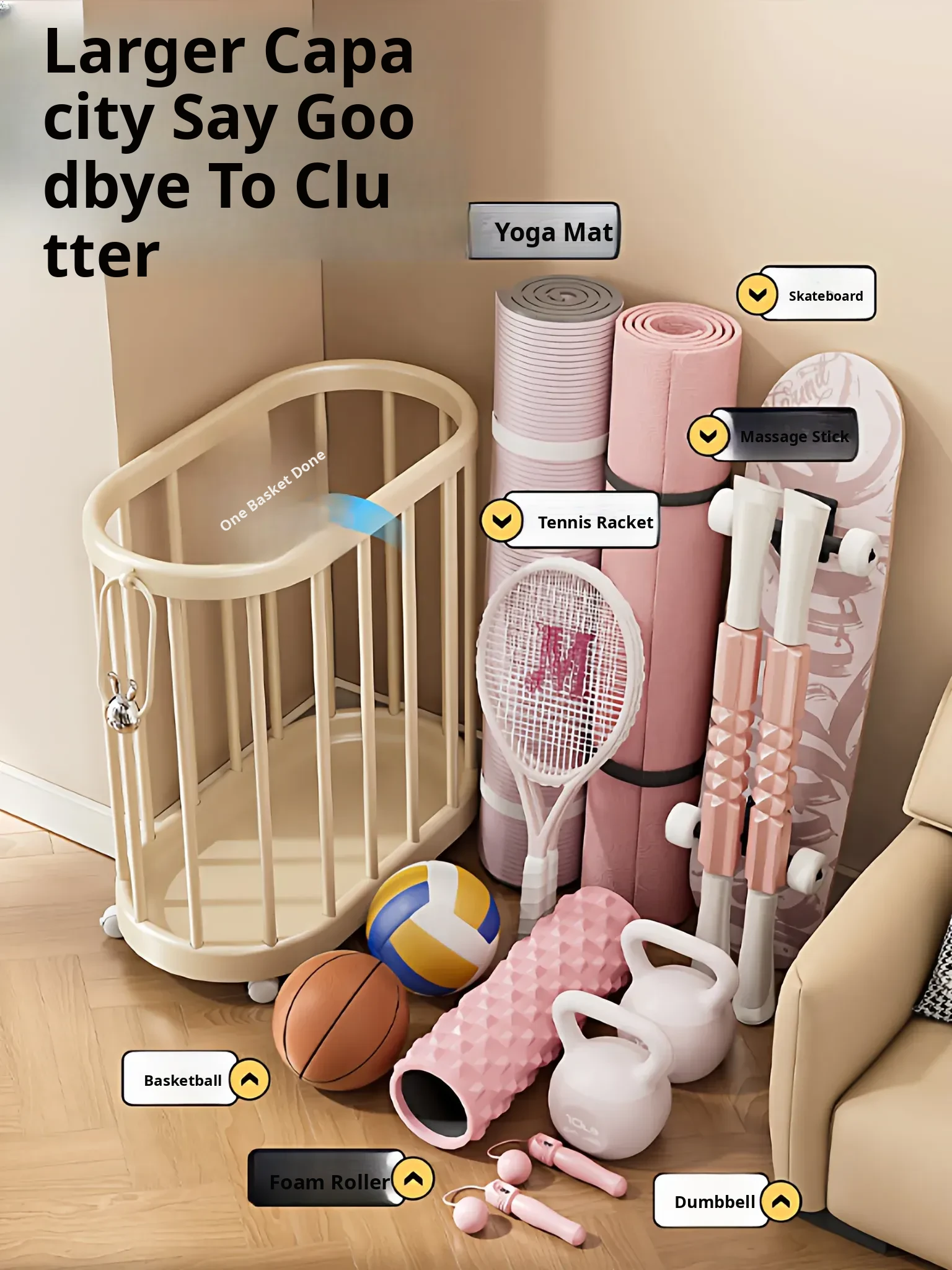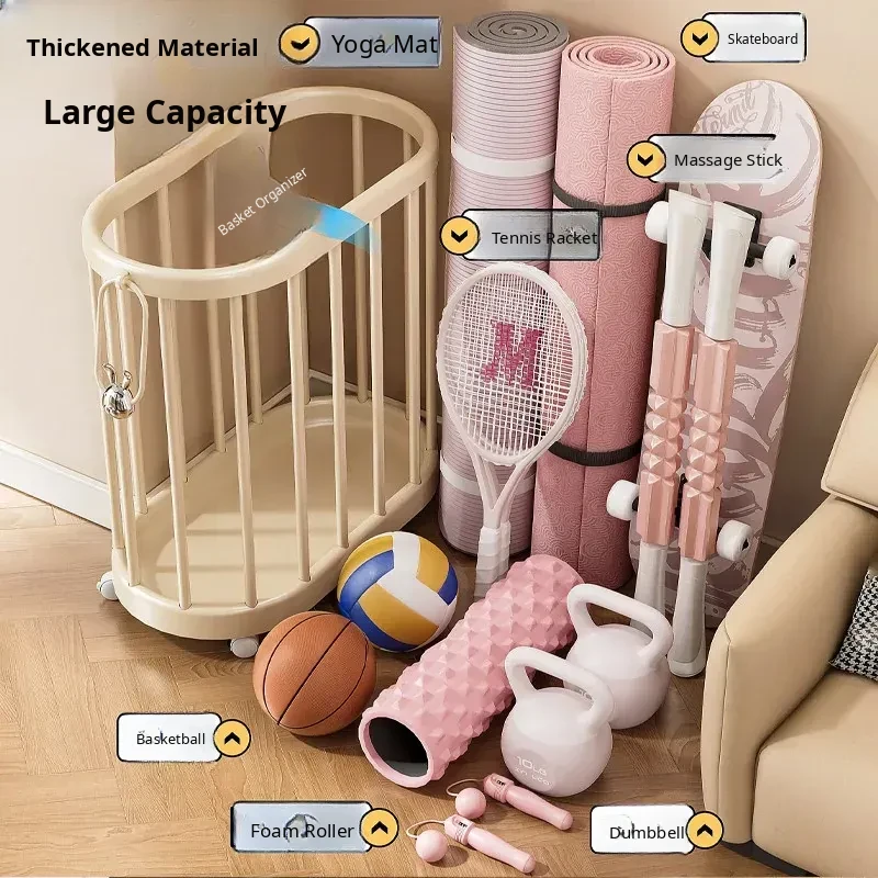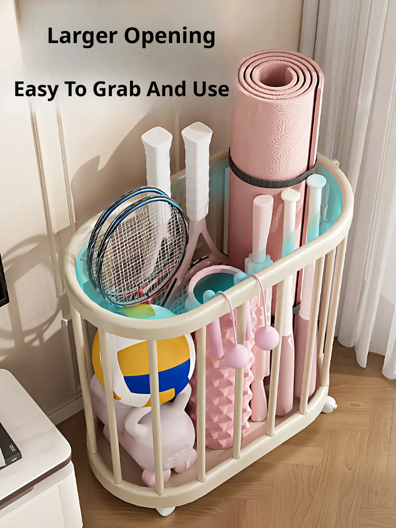 Large Rolling Storage Basket for Exercise Equipment - Home Yoga Mat Organizer with Racket and Sports Ball Rack, Perfect for Keeping Your Workout Space Neat and Tidy!