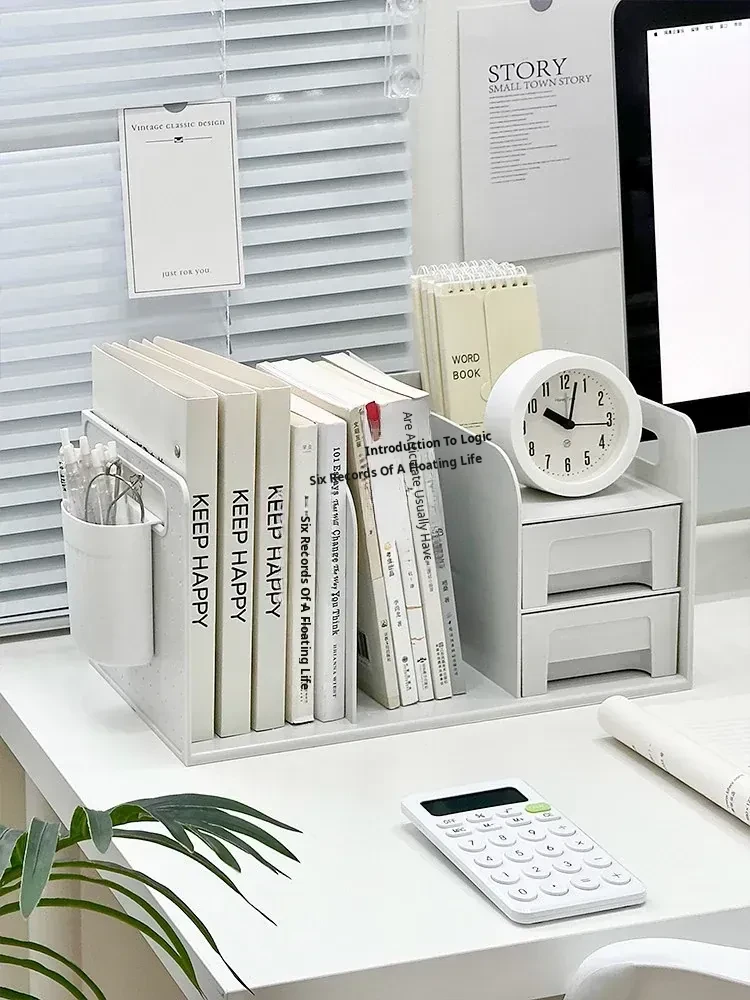 Desktop Organizer Box with Bookends - Stylish Storage Solution for Office Desk, Perfect for Organizing Books, Stationery, and More with Convenient Drawer Design