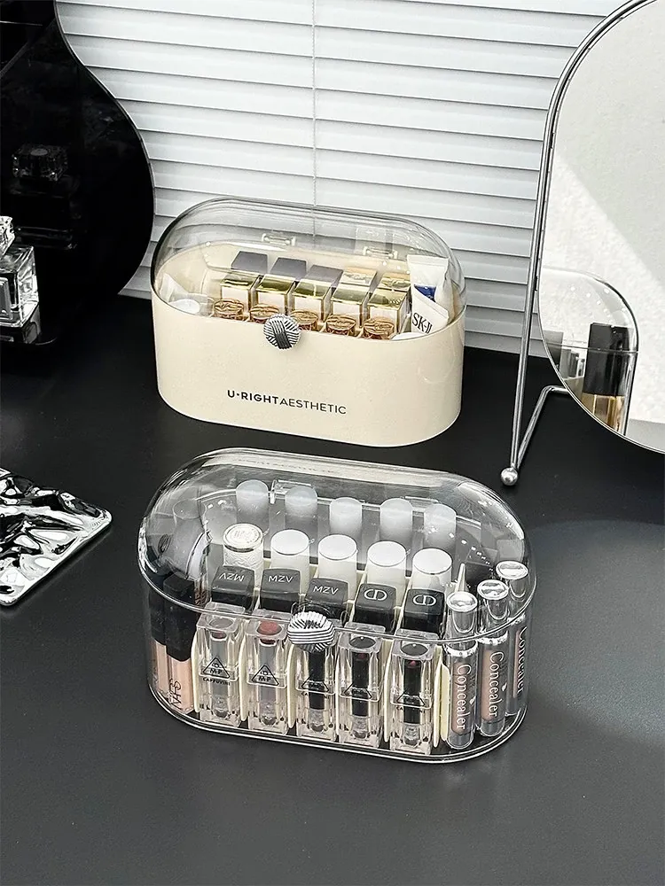 Elegant Desktop Lipstick Organizer with Lid - Dustproof Makeup Storage Box with Transparent Dividers for a Stylish Vanity Setup