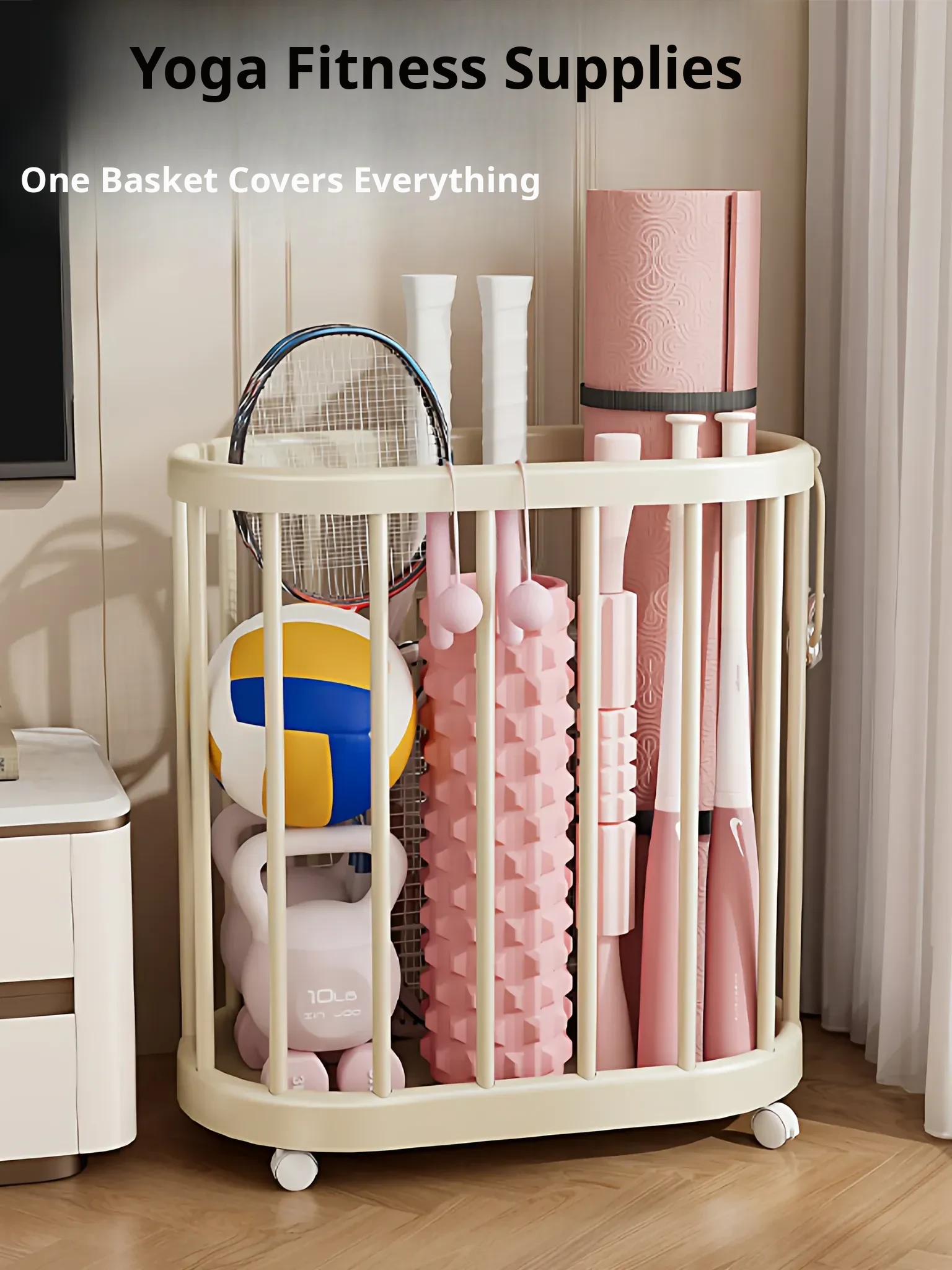 Home Gym Storage Basket with Wheels - Yoga Mat Organizer, Basketball & Racket Holder, Dumbbell Rack, and Laundry Hamper - Perfect for Keeping Your Workout Space Tidy!