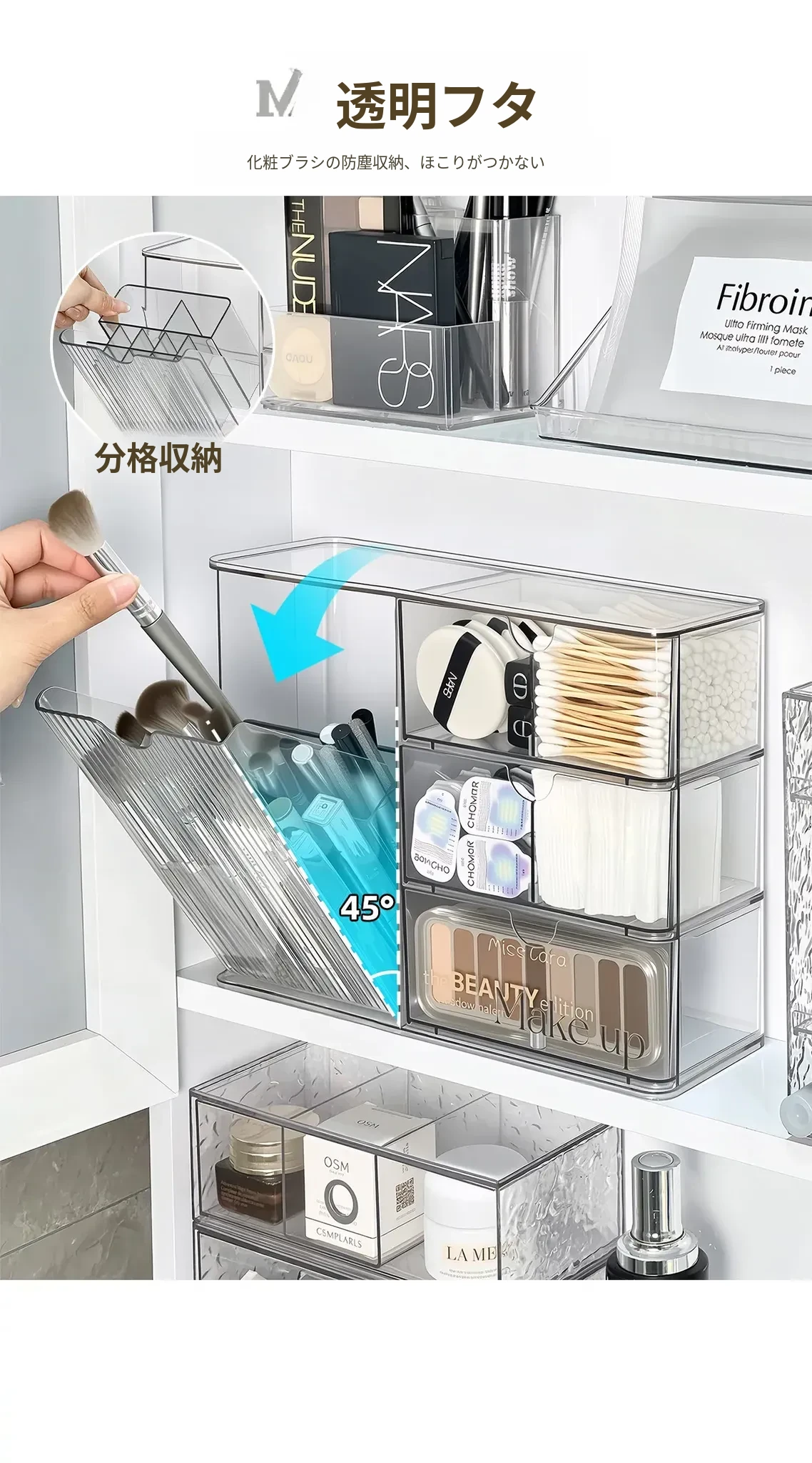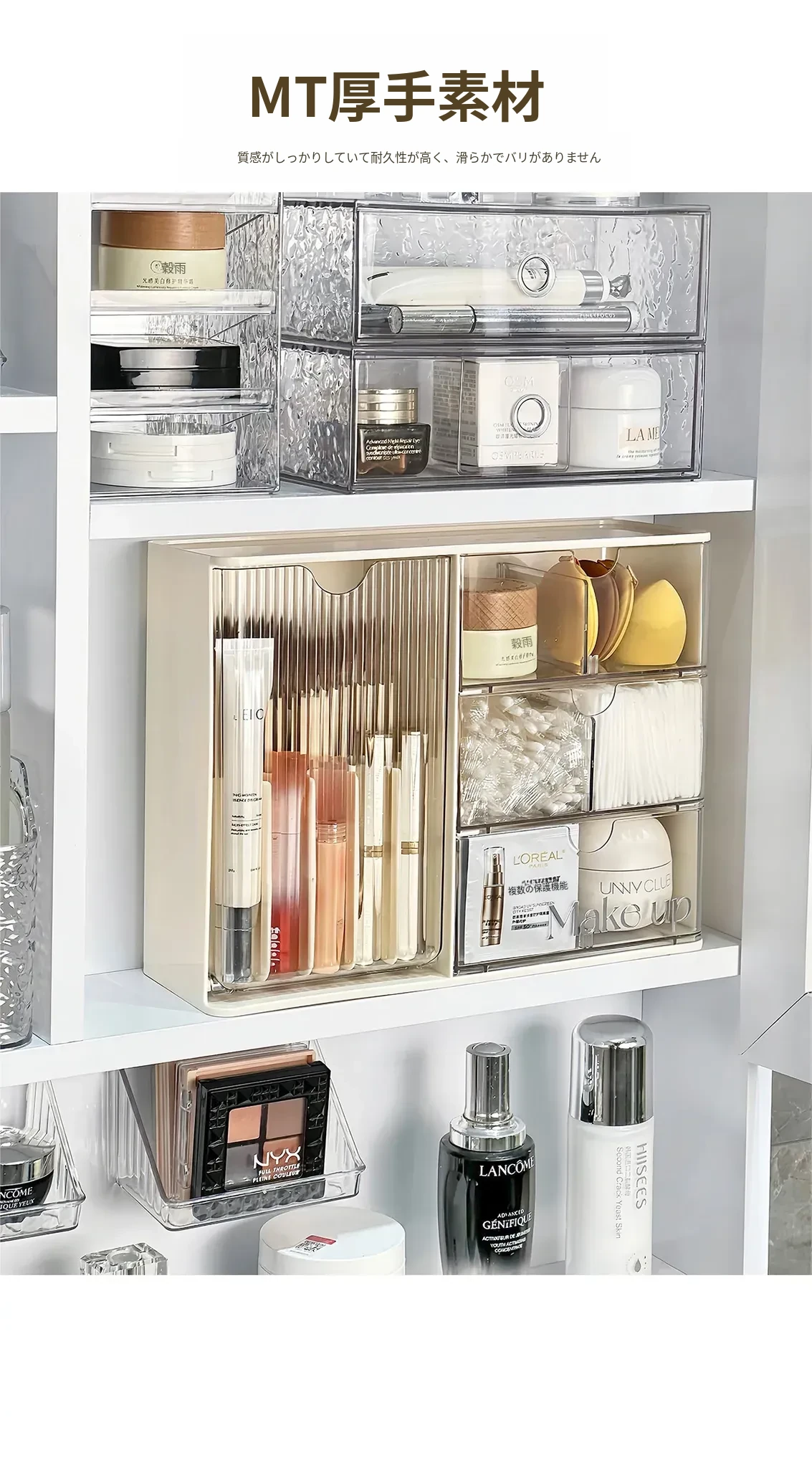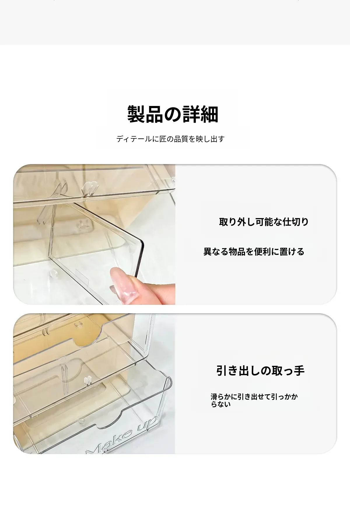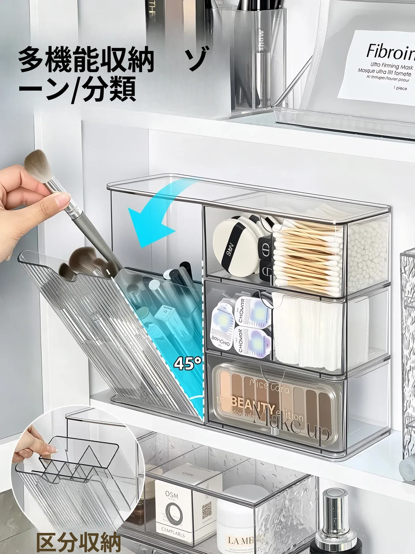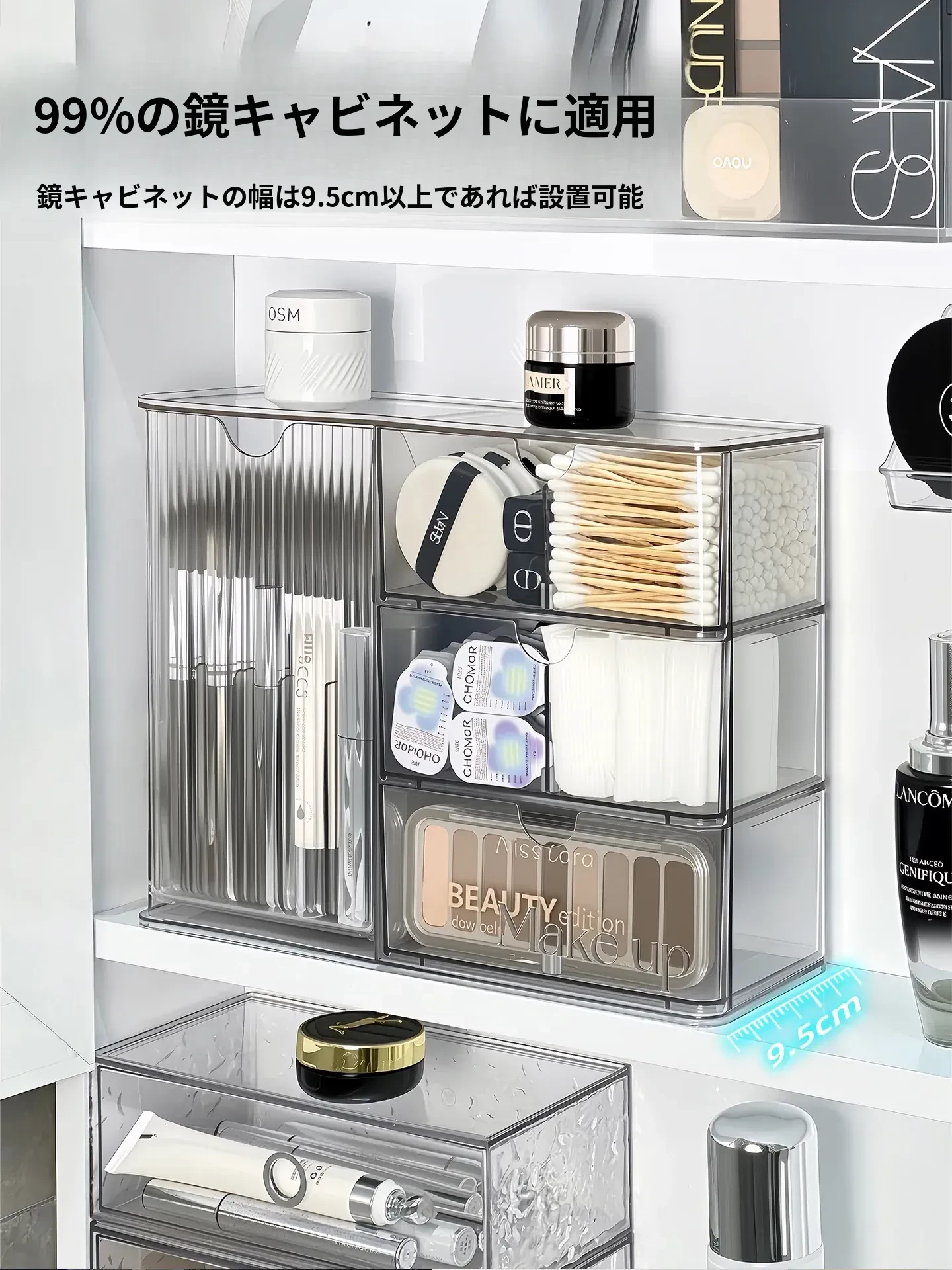 洗面所に最適!化粧品や口紅をスッキリ整理できる引き出し式のアクリル収納ボックス。メイク落とし用コットンや綿棒も収納可能!美しい空間を作り出す収納アイテムです。