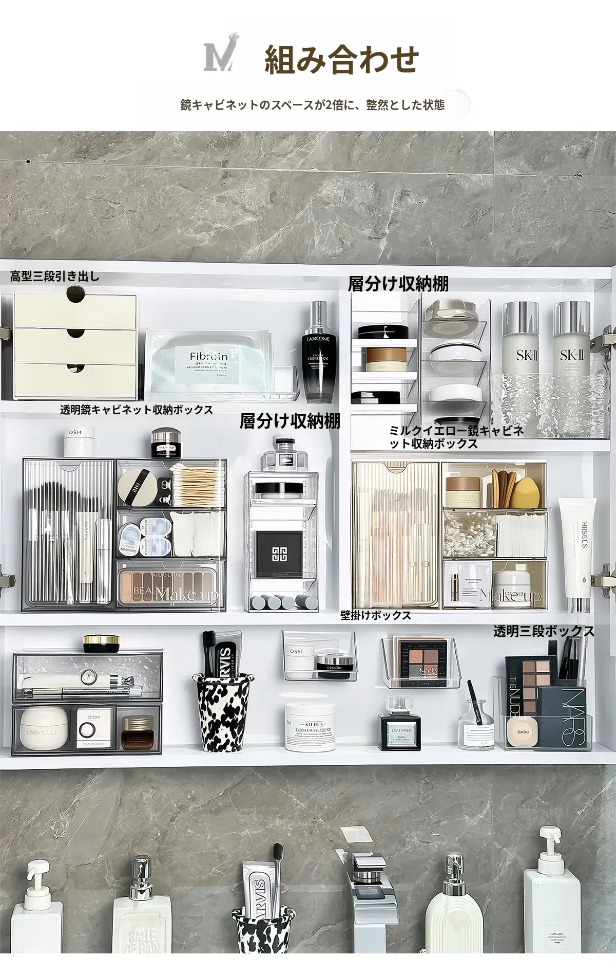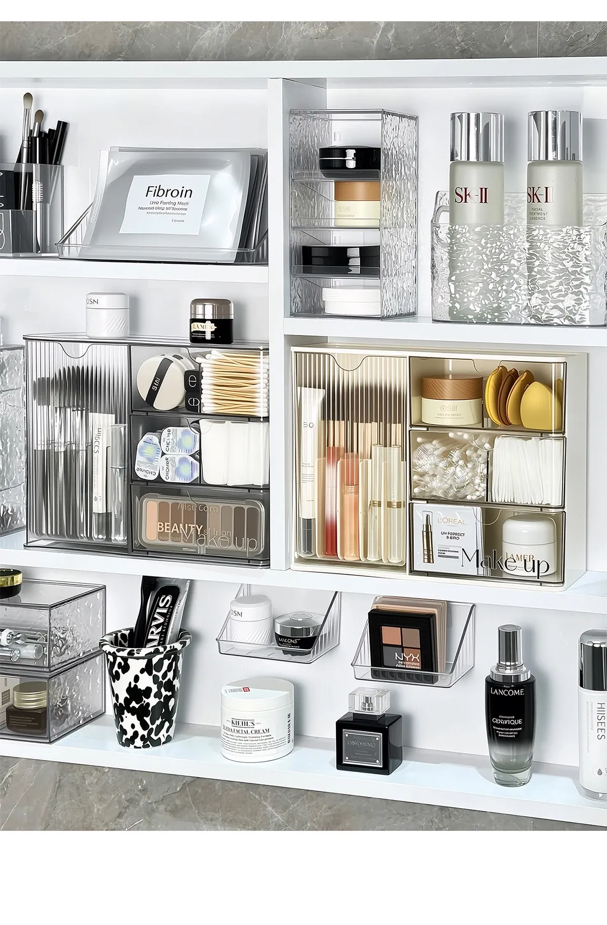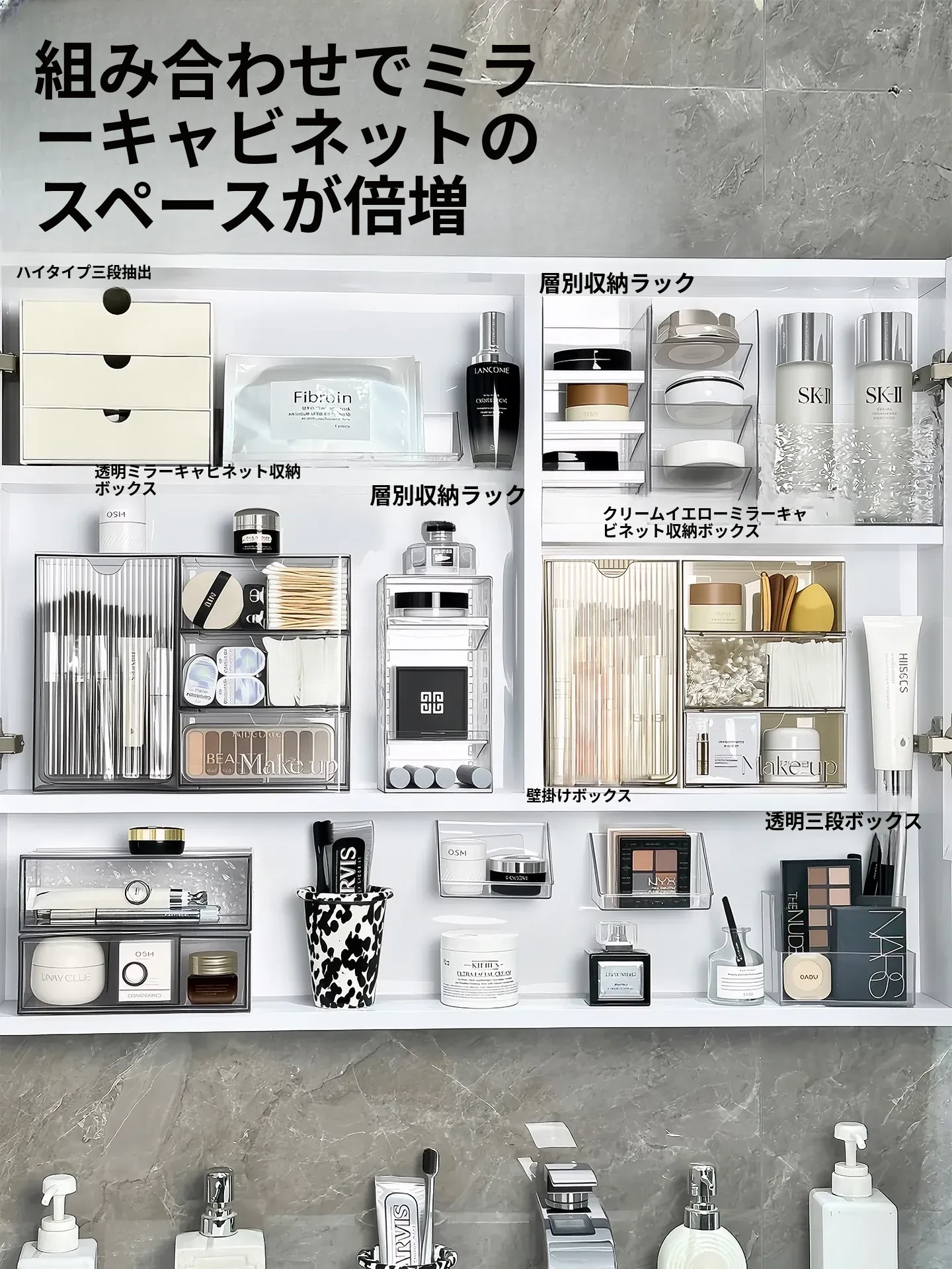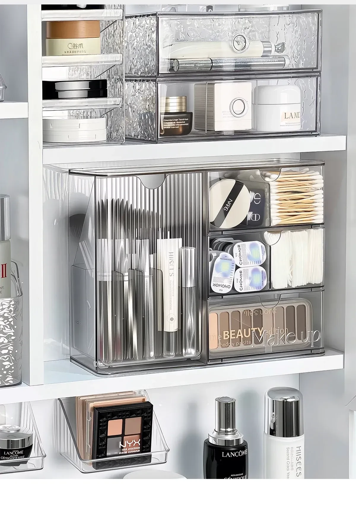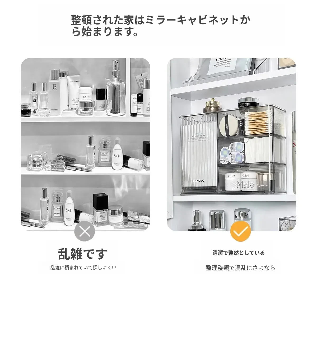 洗面所に最適!化粧品や口紅をスッキリ整理できる引き出し式のアクリル収納ボックス。メイク落とし用コットンや綿棒も収納可能!美しい空間を作り出す収納アイテムです。