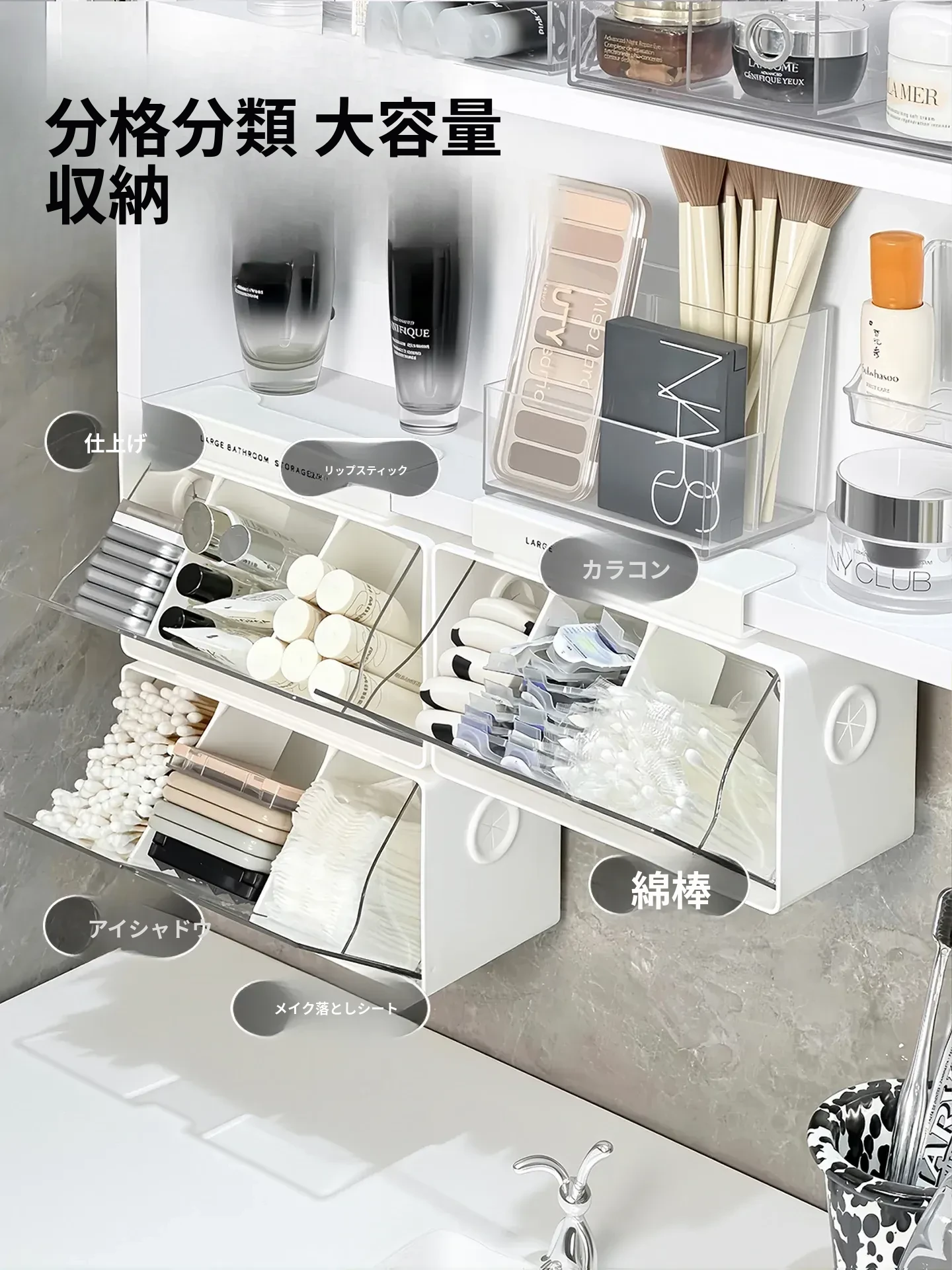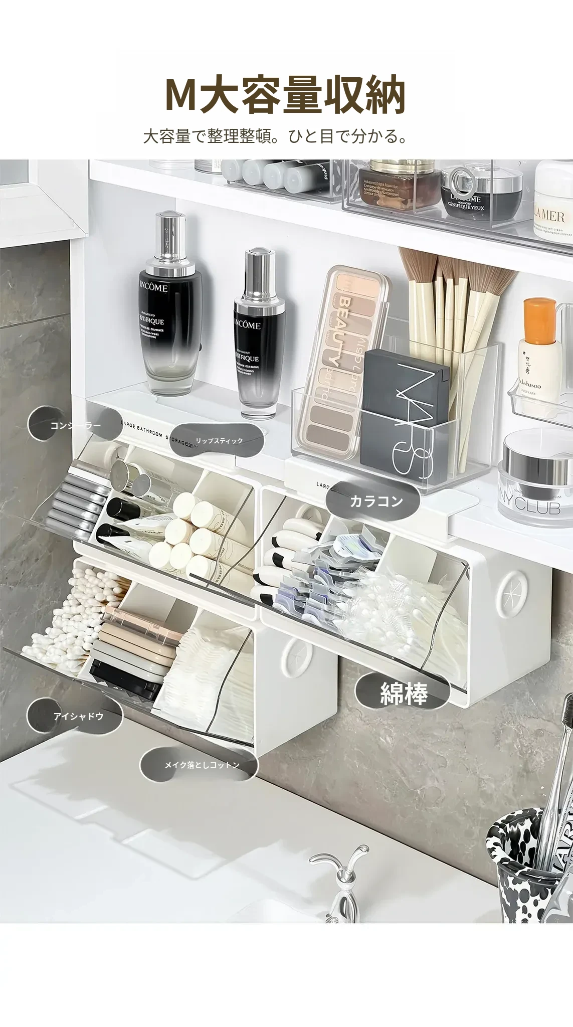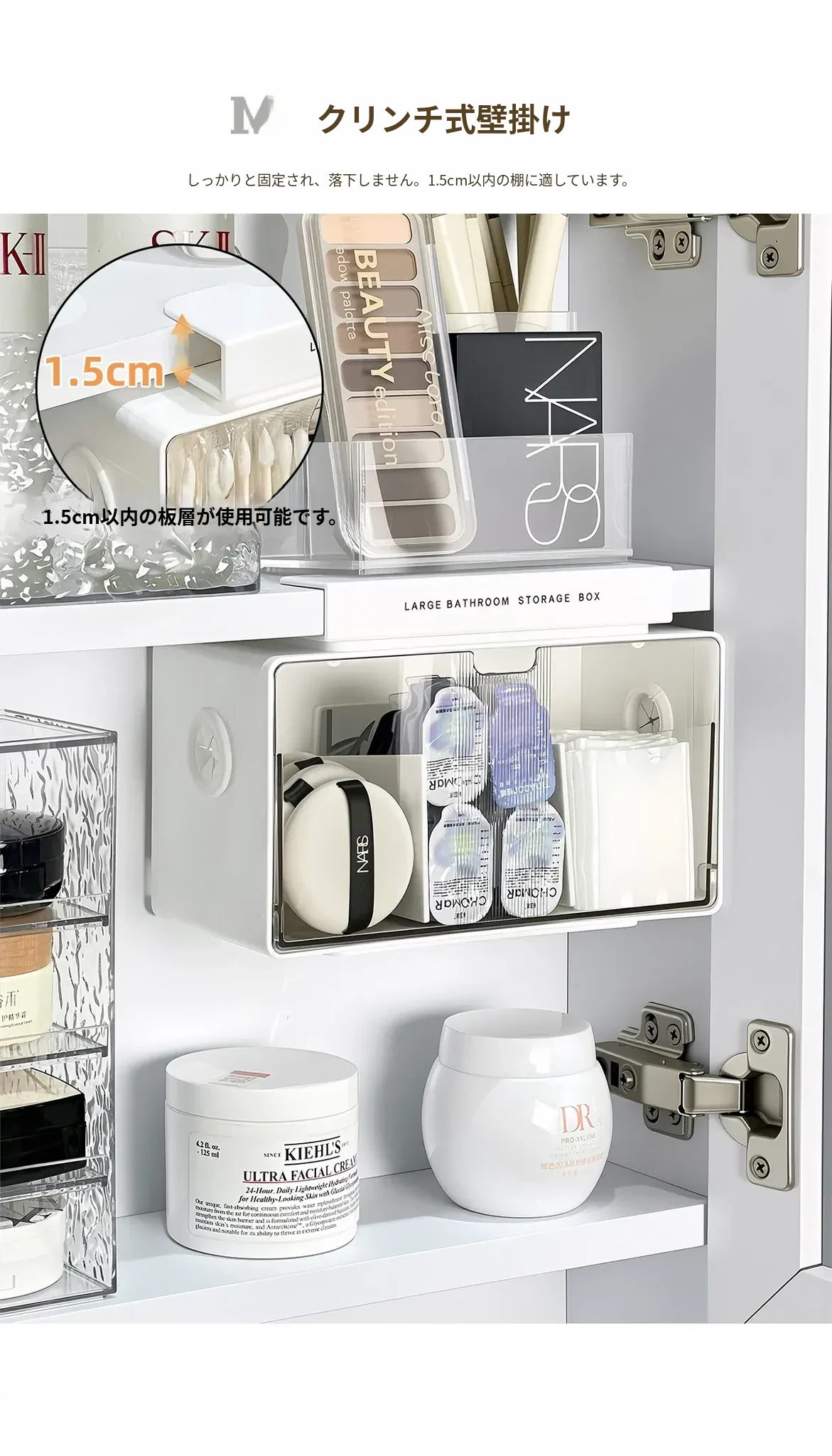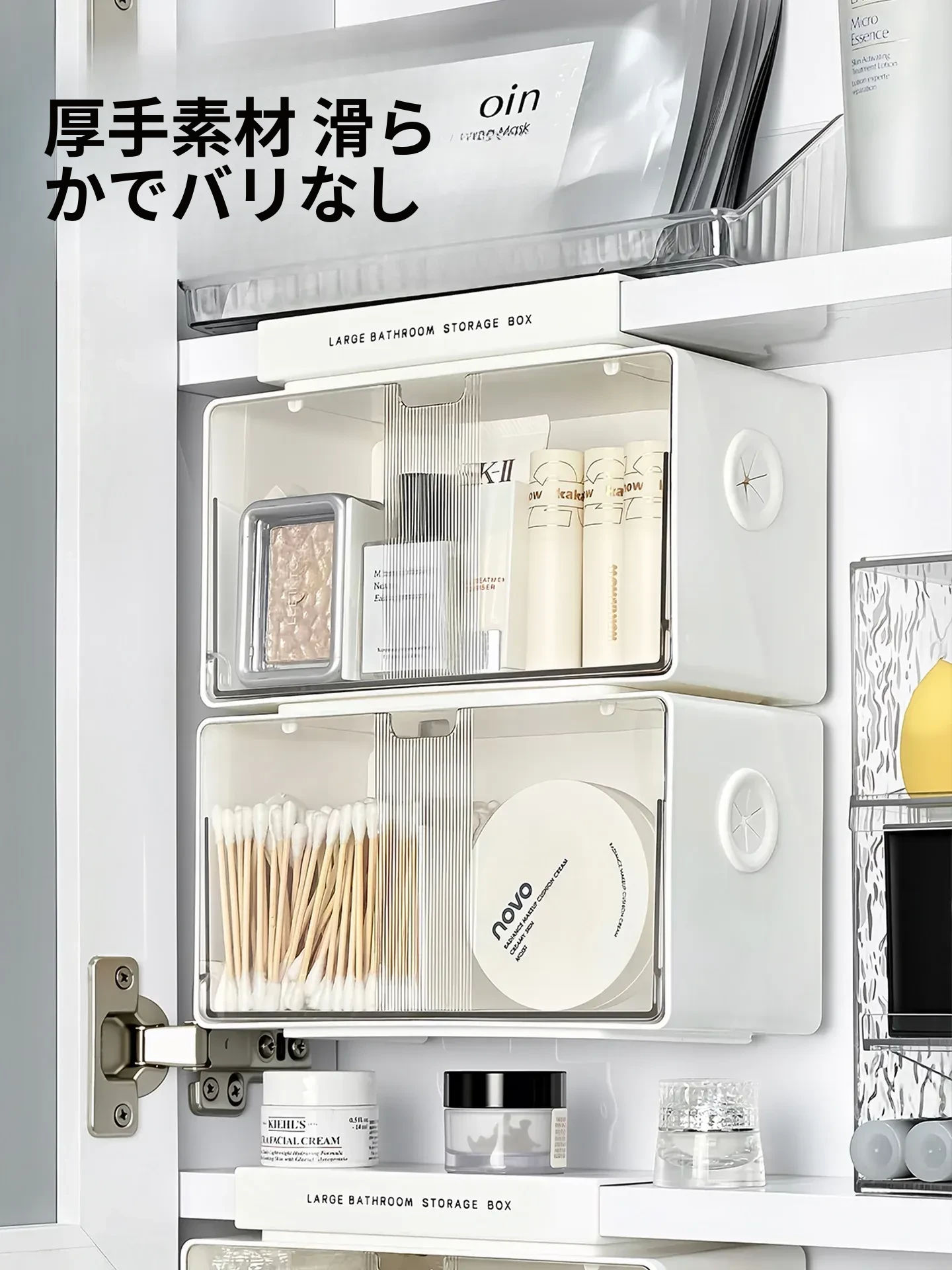 アクリル透明化粧品収納ボックス - 鏡付きキャビネット専用整理棚!バスルームの必需品、効率的にスペースを活用し、化粧品をスッキリ整理。使いやすい仕切り付きで、美しさを保つお手伝いをします。
