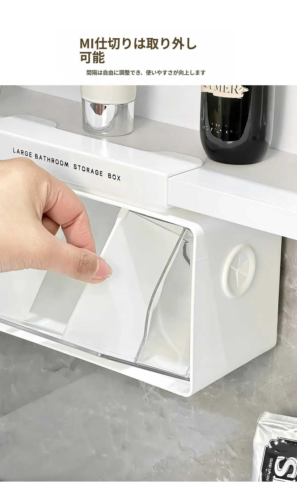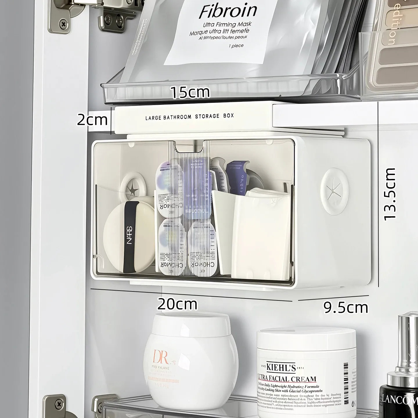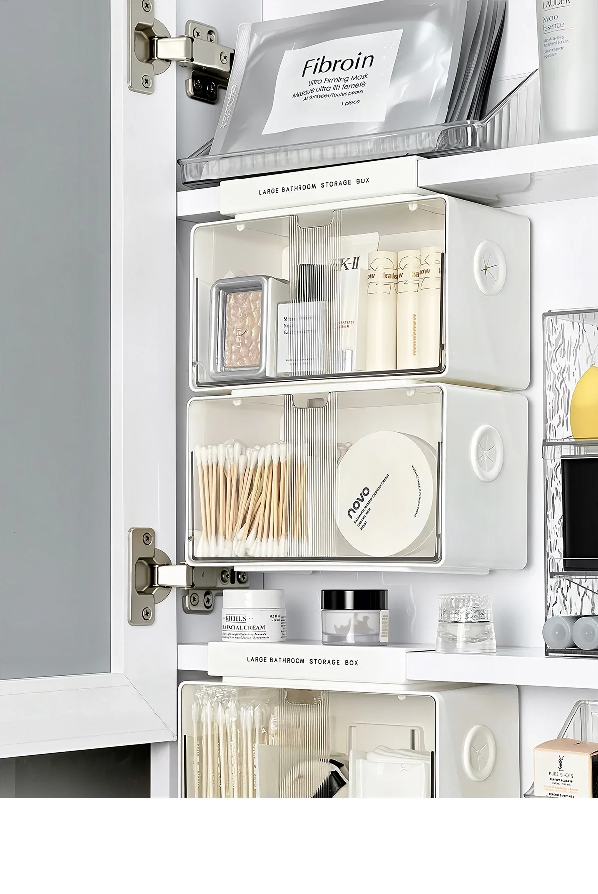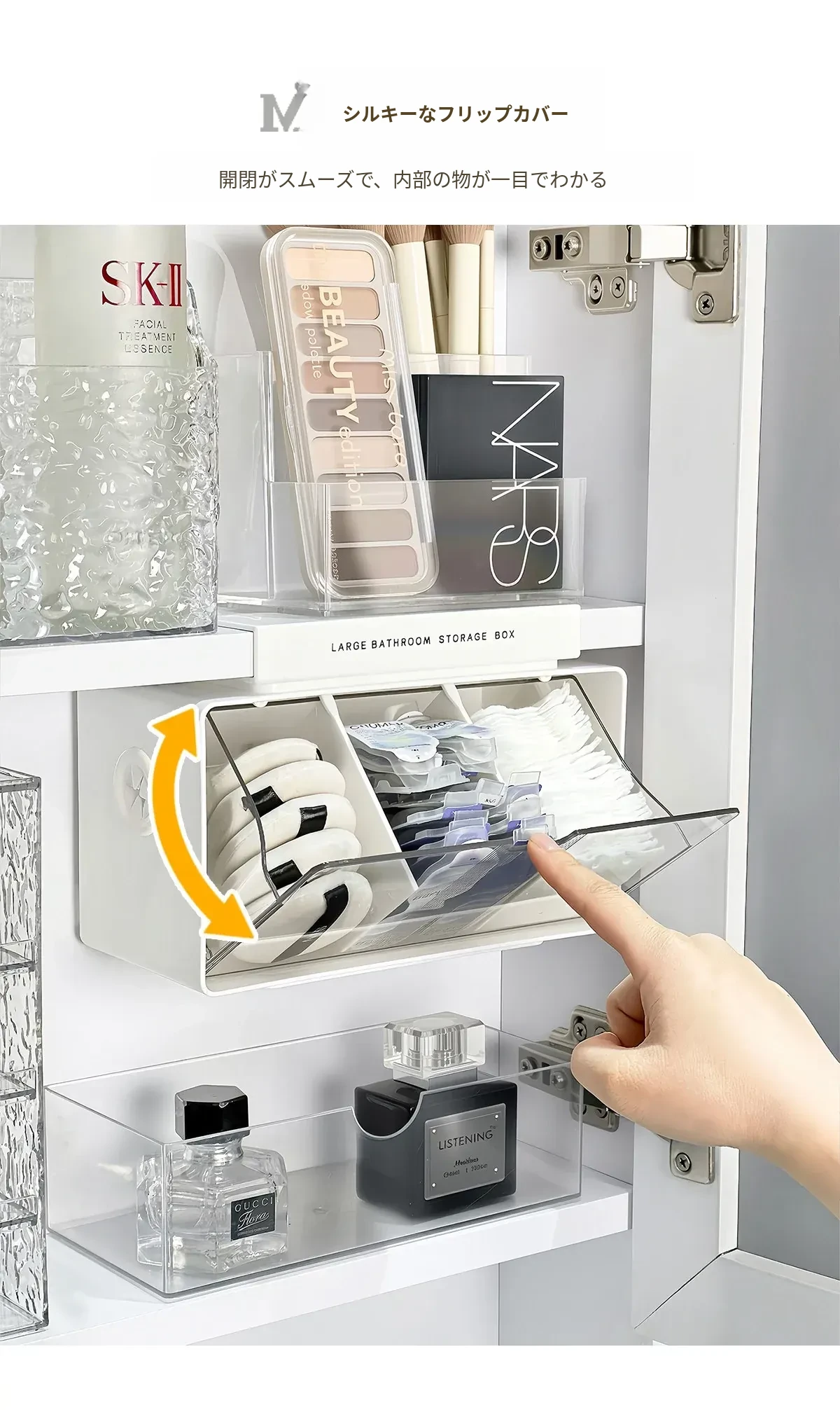 アクリル透明化粧品収納ボックス - 鏡付きキャビネット専用整理棚!バスルームの必需品、効率的にスペースを活用し、化粧品をスッキリ整理。使いやすい仕切り付きで、美しさを保つお手伝いをします。