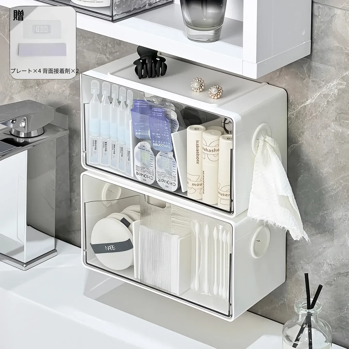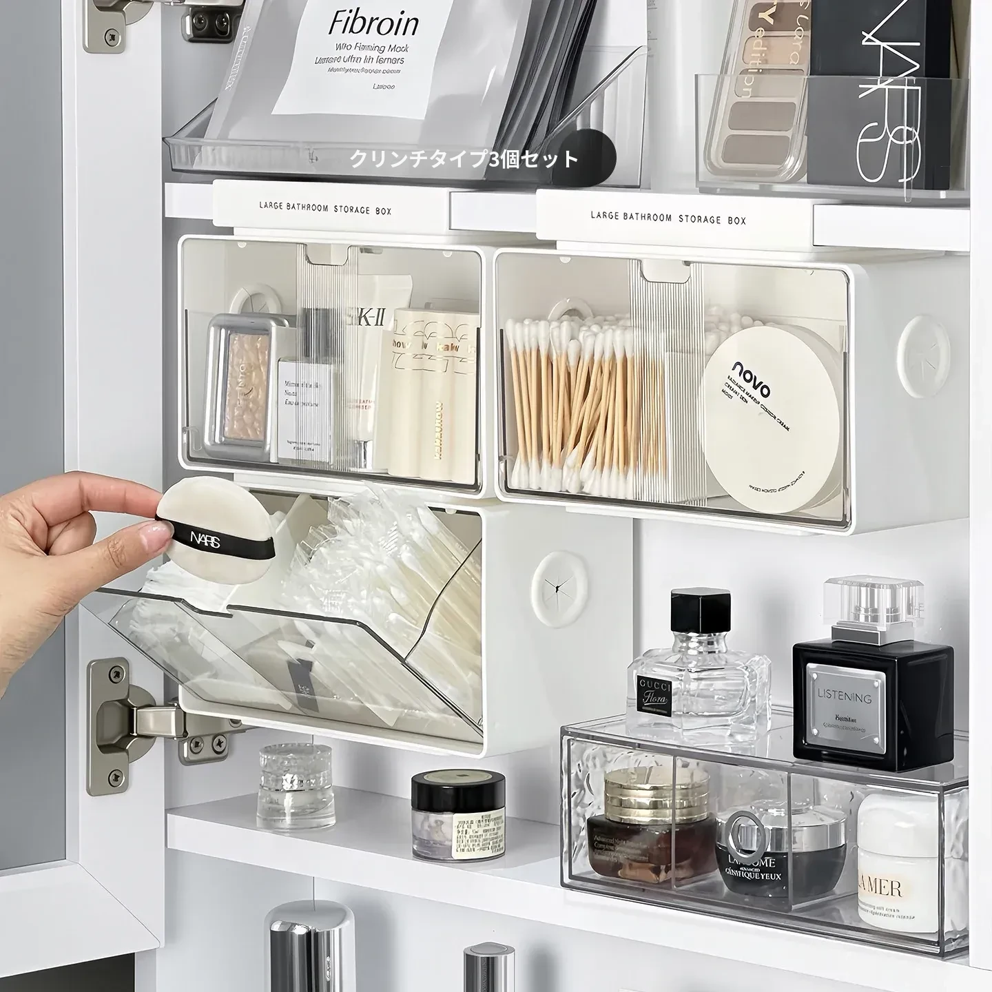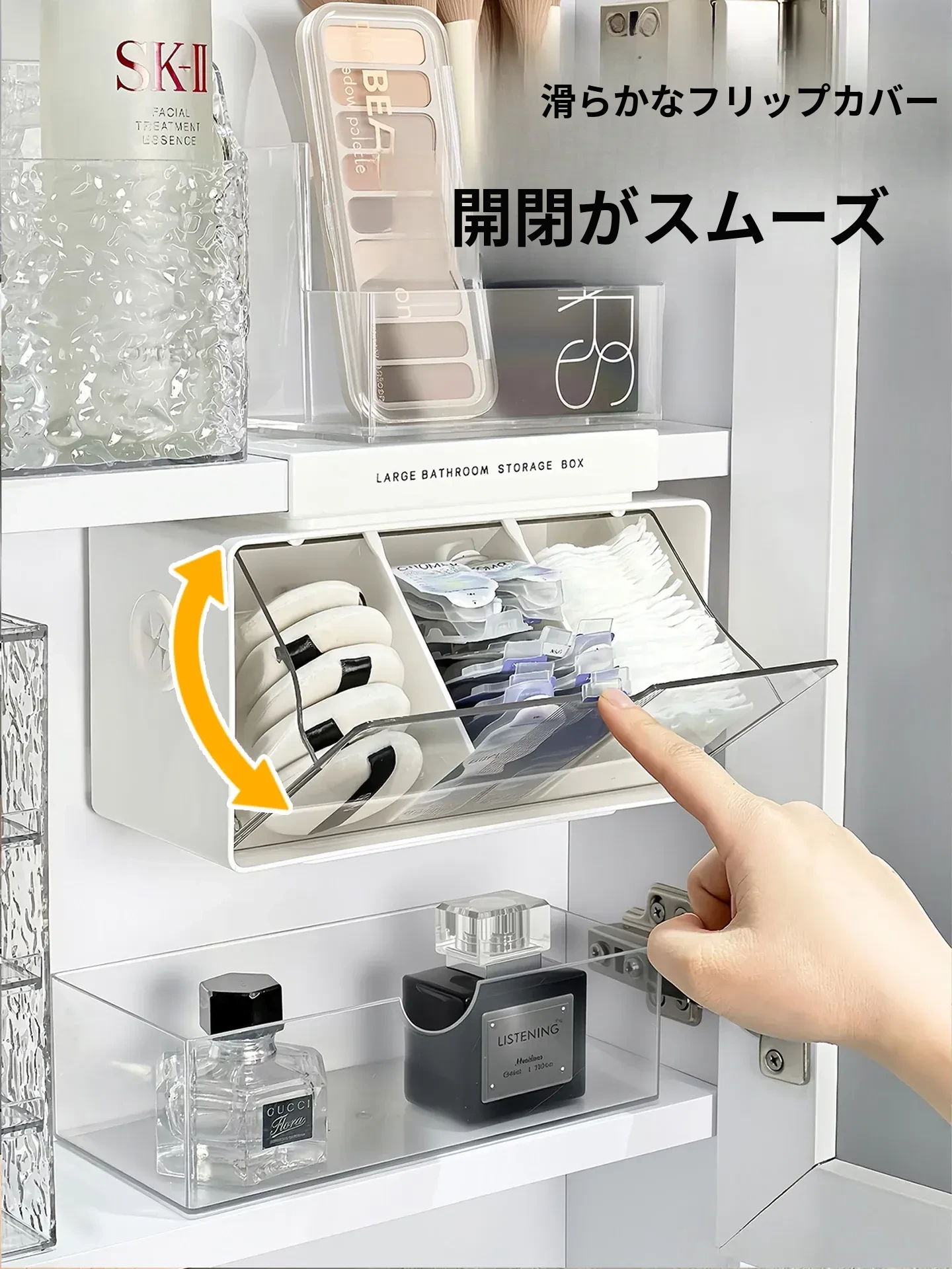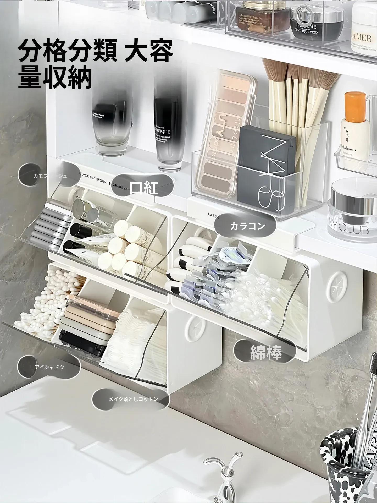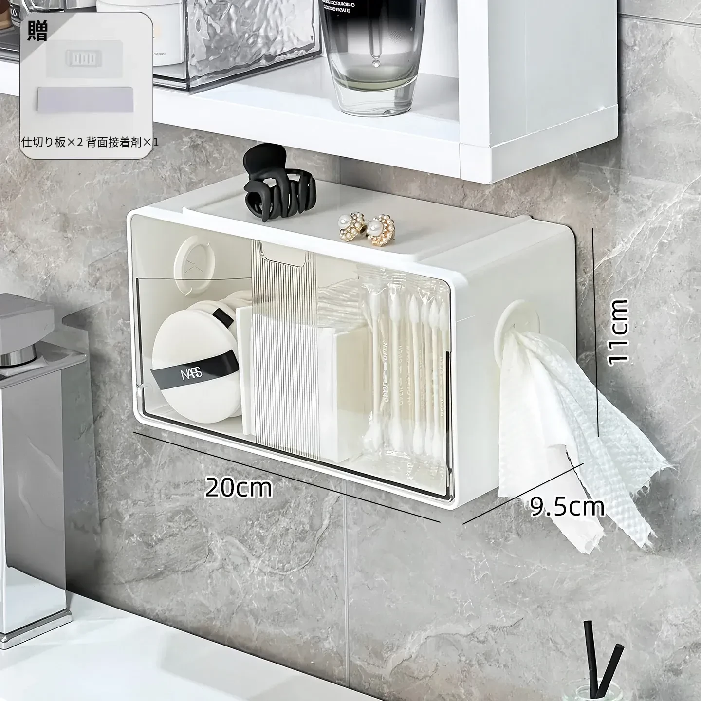 アクリル透明化粧品収納ボックス - 鏡付きキャビネット専用整理棚!バスルームの必需品、効率的にスペースを活用し、化粧品をスッキリ整理。使いやすい仕切り付きで、美しさを保つお手伝いをします。