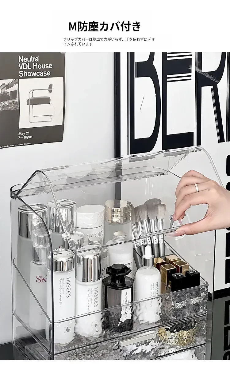 透明化粧品収納ボックス【防塵タイプ】口紅トレイ付き