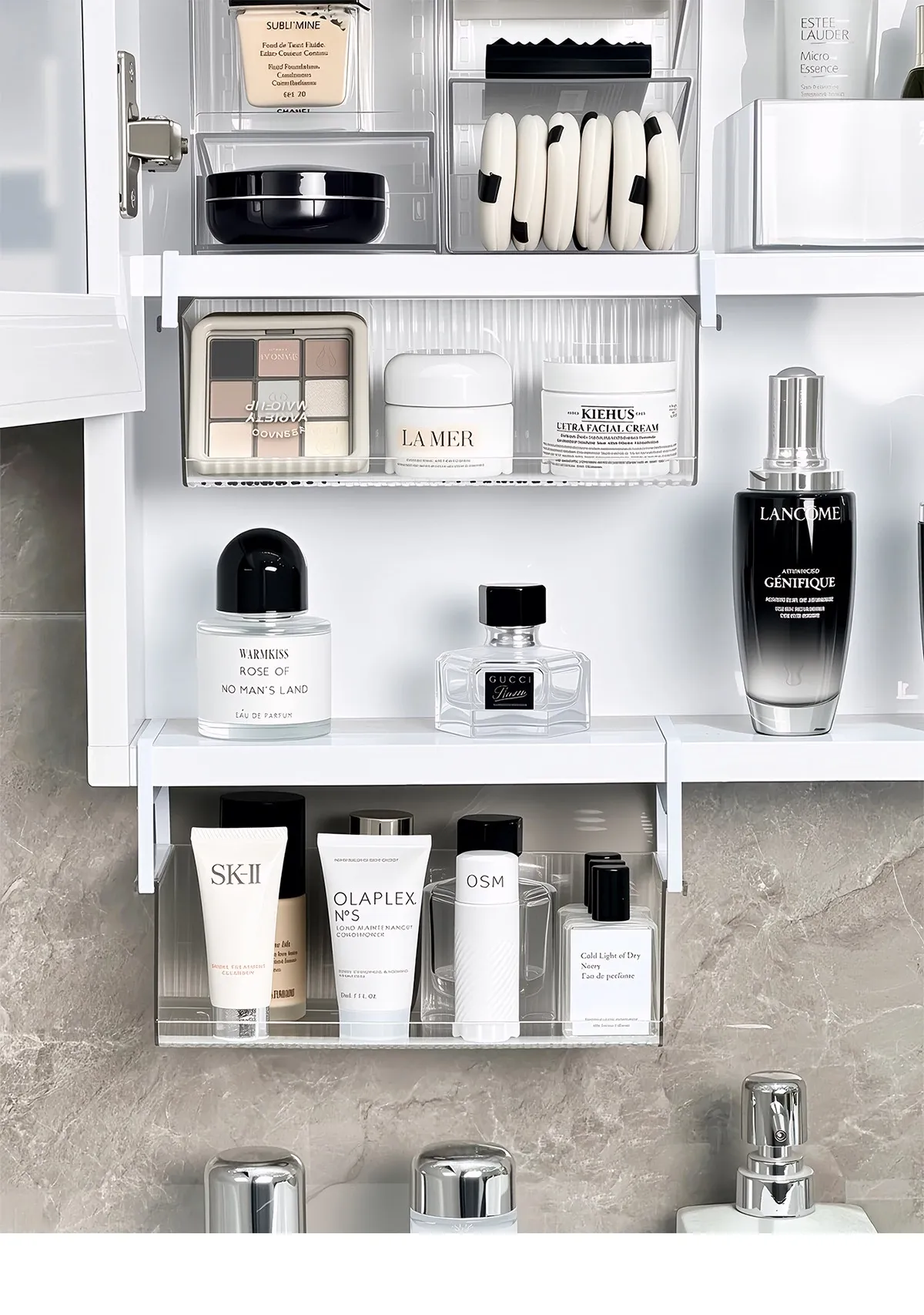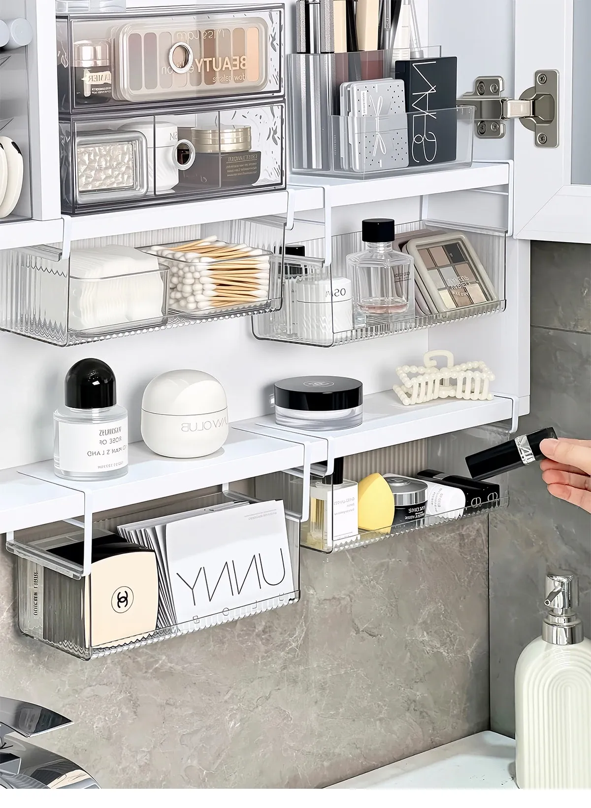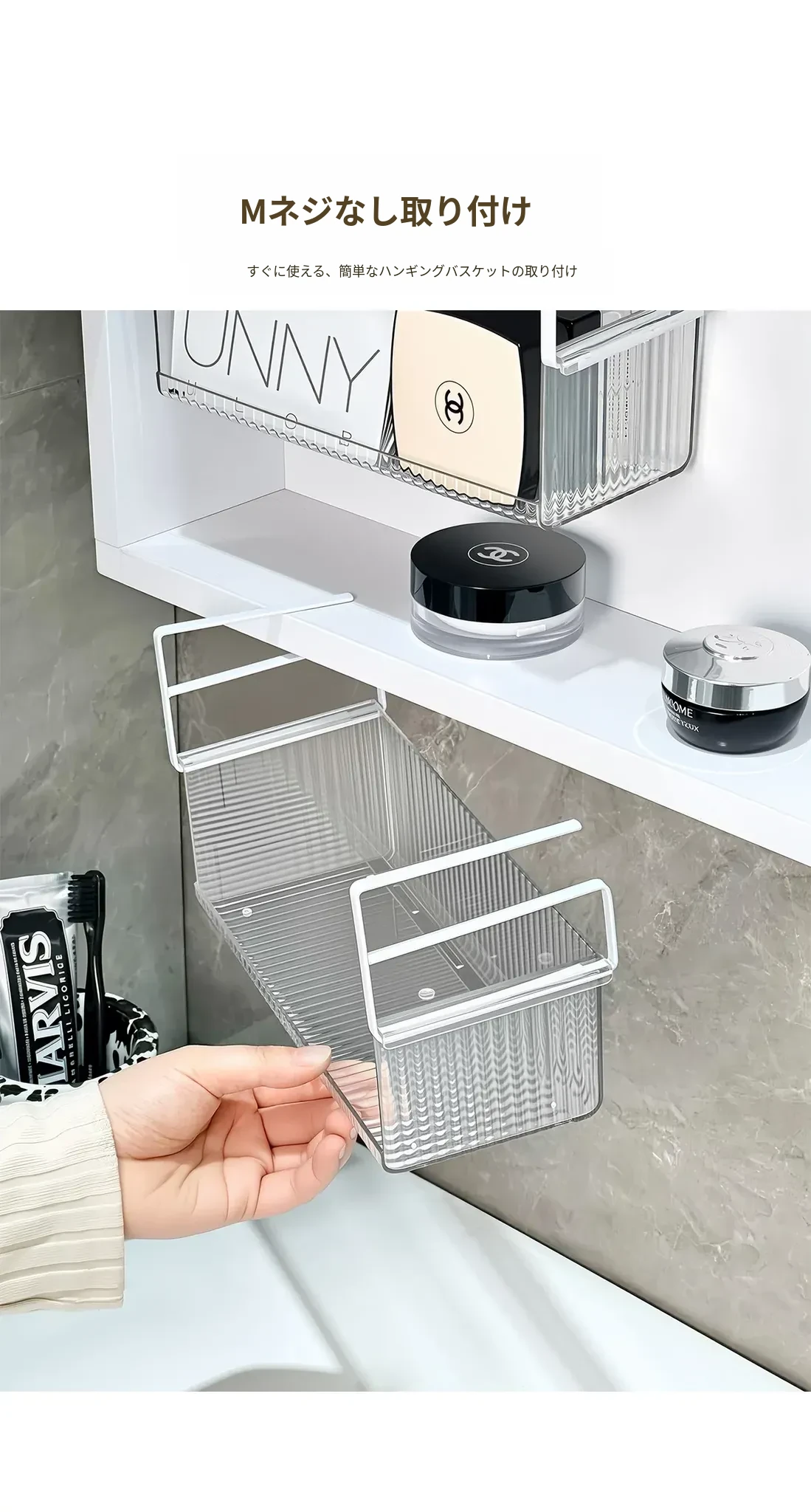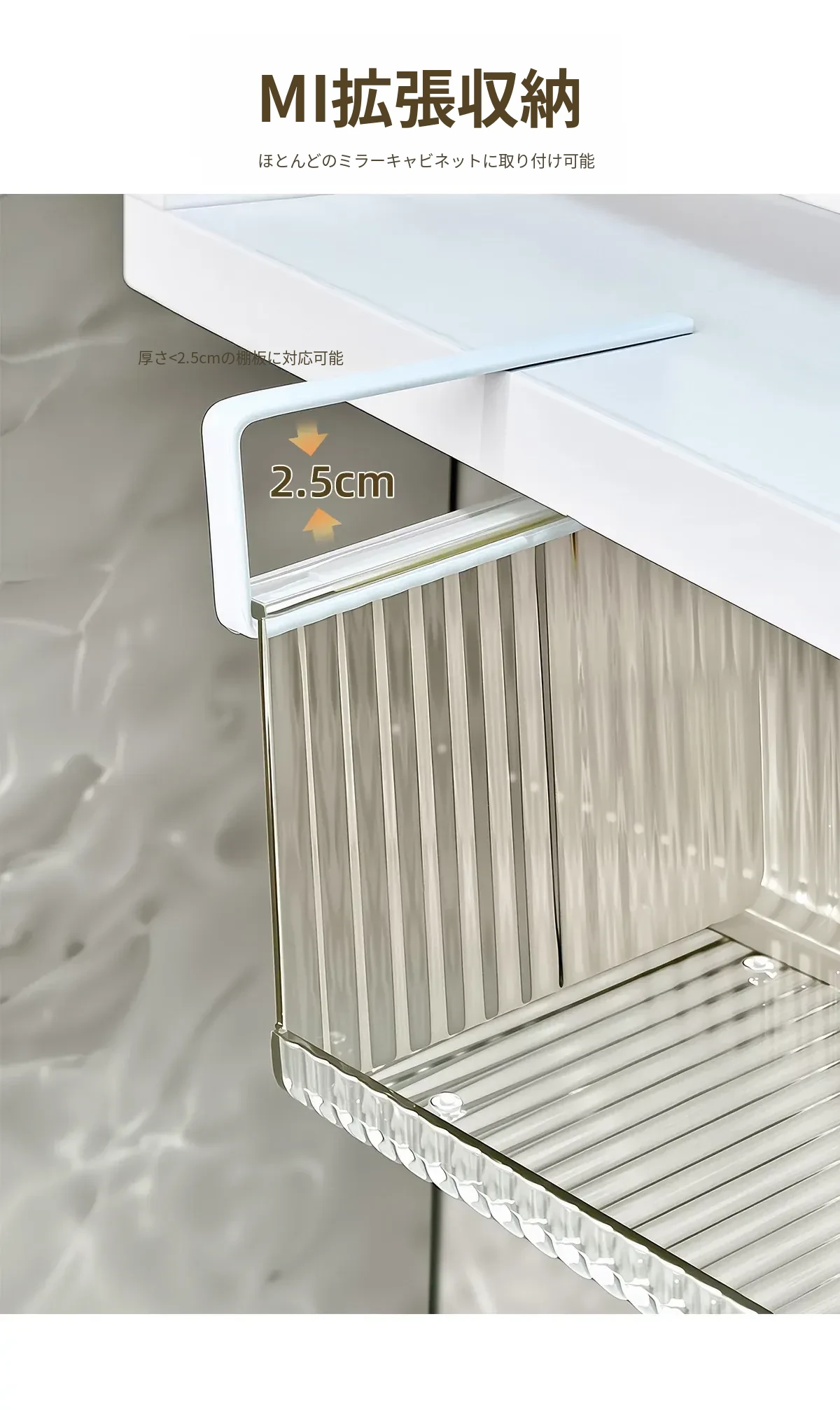 透明アクリル製ミラーキャビネット収納ボックス - バスルーム用化粧品整理ラック!コットンやクレンジングパッドもすっきり収納できる便利なアイテム。おしゃれで実用的な収納で、あなたの毎日の美容ルーチンをサポートします!