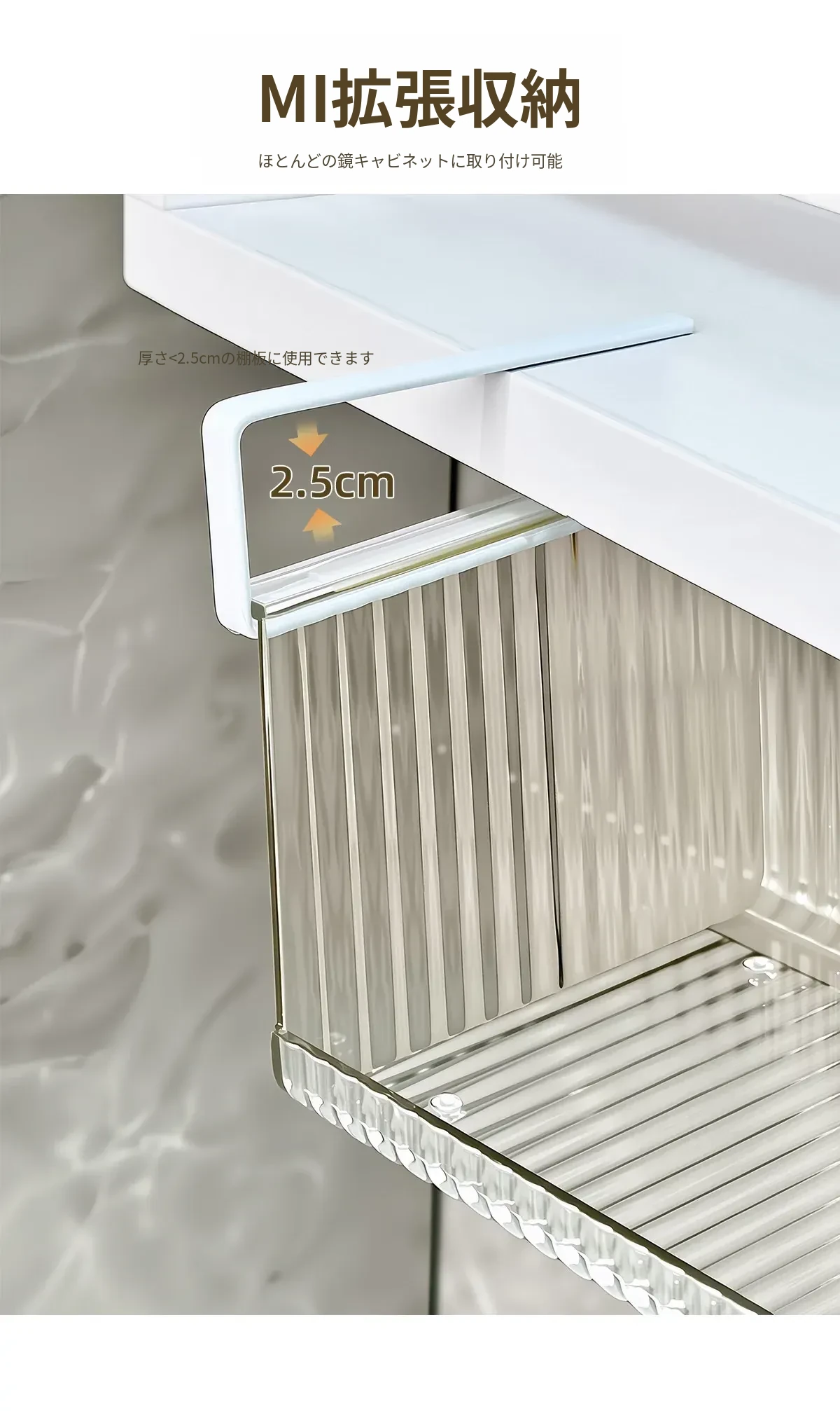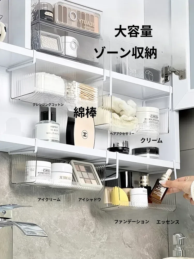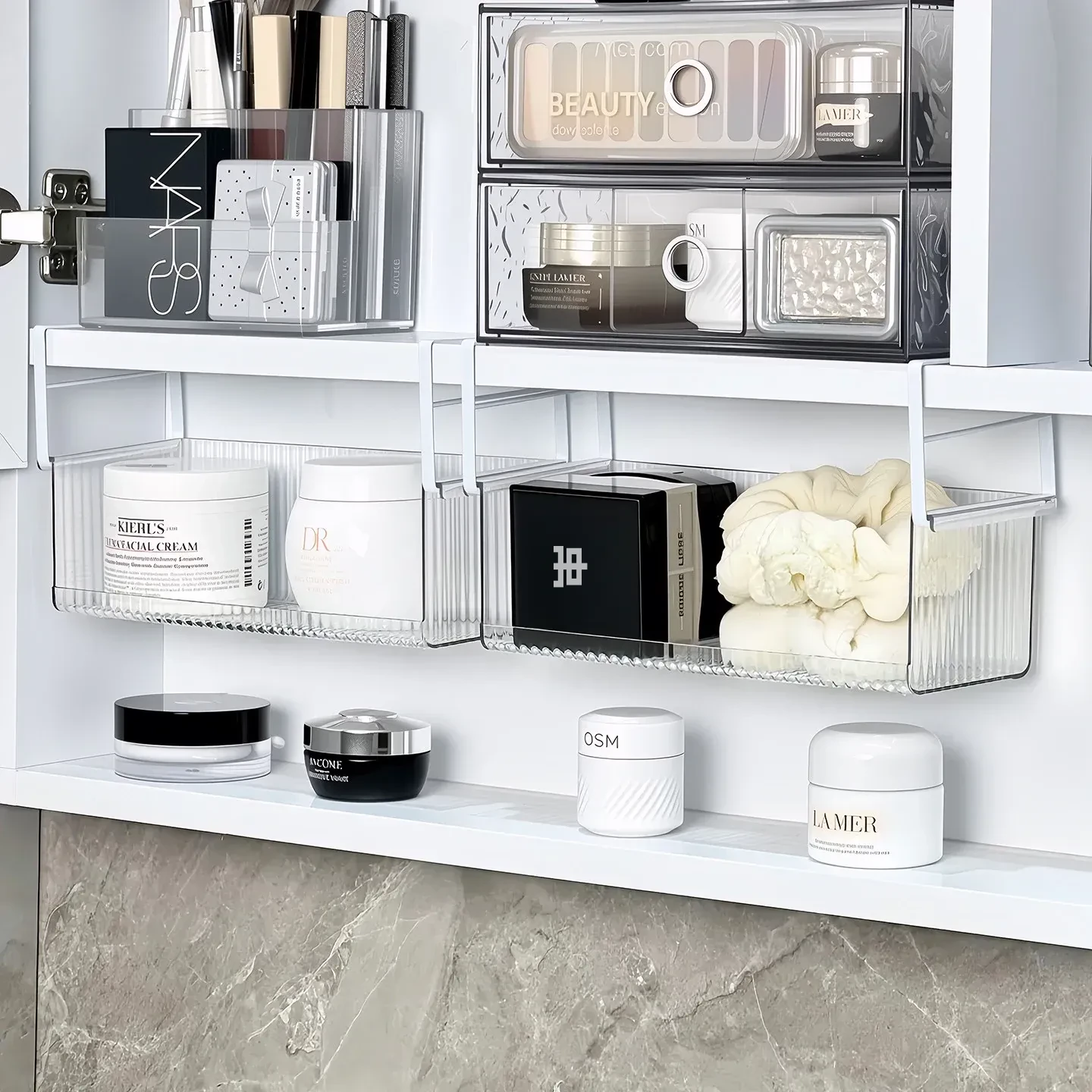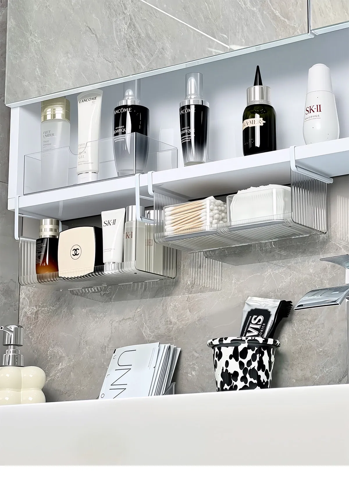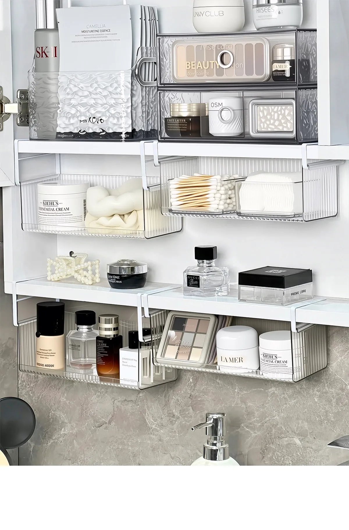 鏡台下の収納ボックス・吊り下げ式化粧品ラック!バスルームやトイレに最適なスキンケア用品やコットン収納にぴったり。美しい空間を作り出し、すっきり整理整頓!