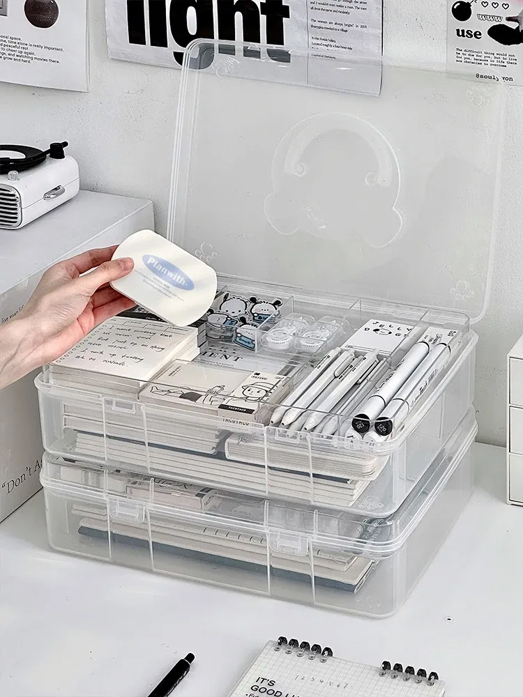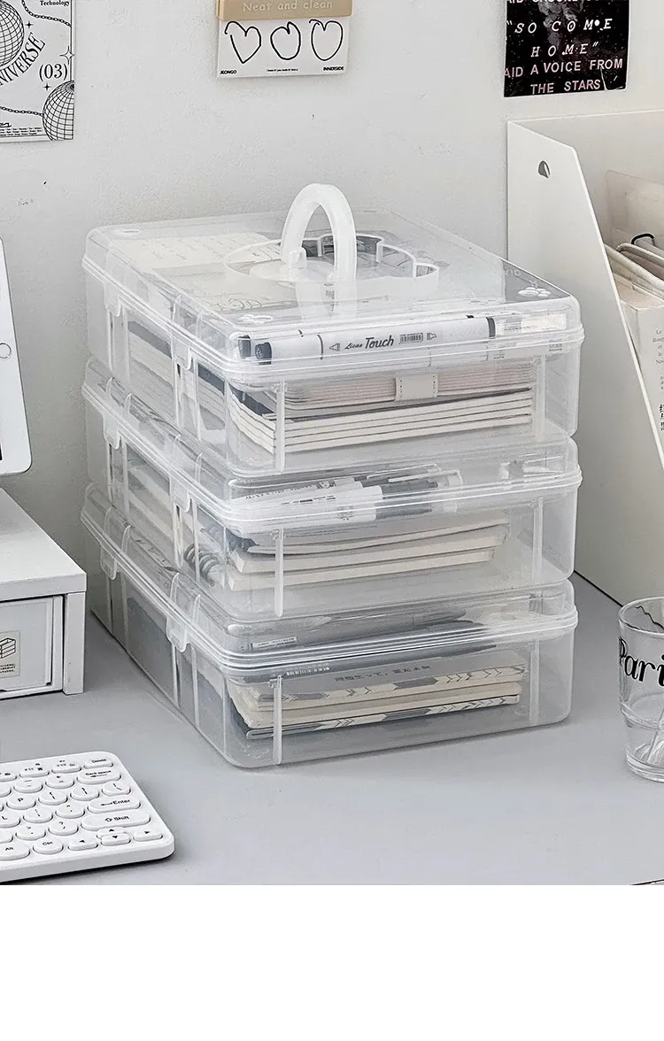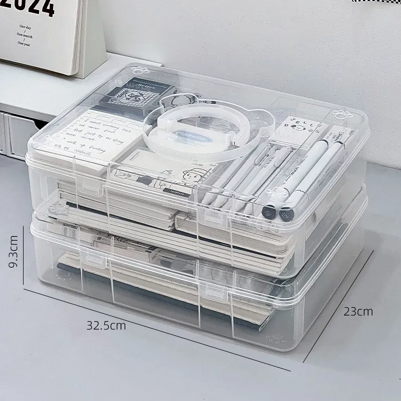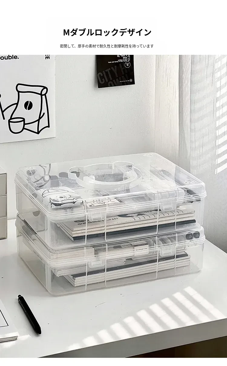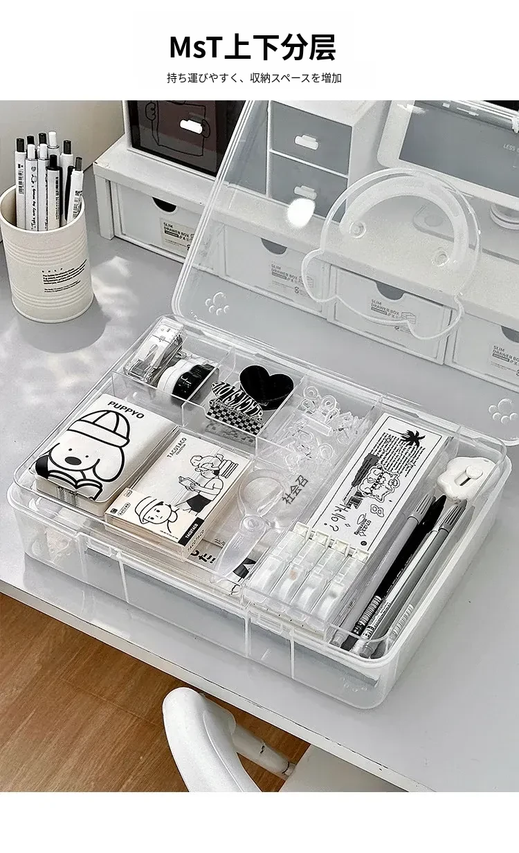 大容量!学生必备手提書籍収納ボックス - 教室やデスク用の二層仕切りで整理整頓!プラスチック製で軽量、持ち運びも簡単!