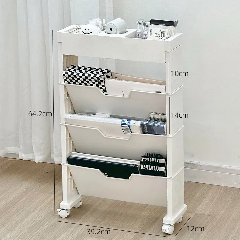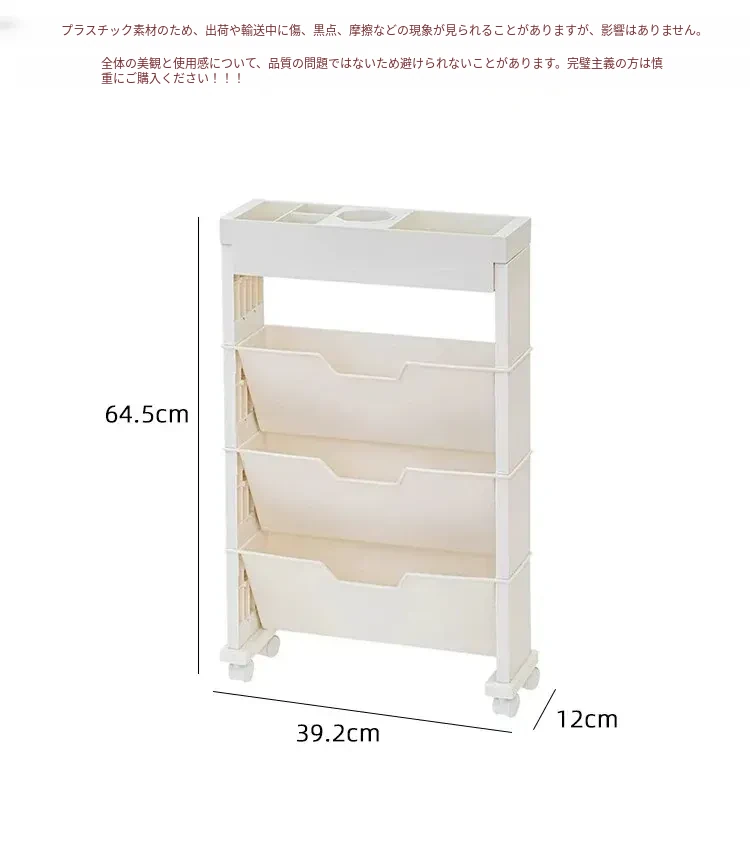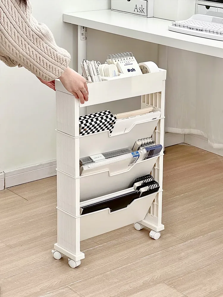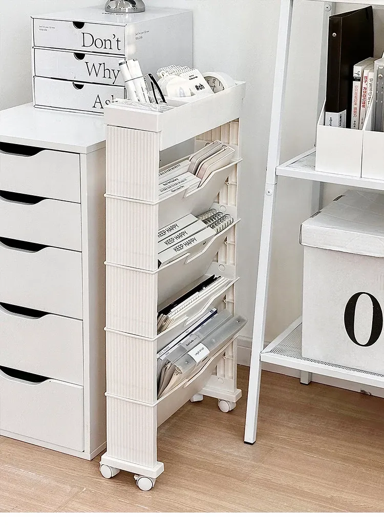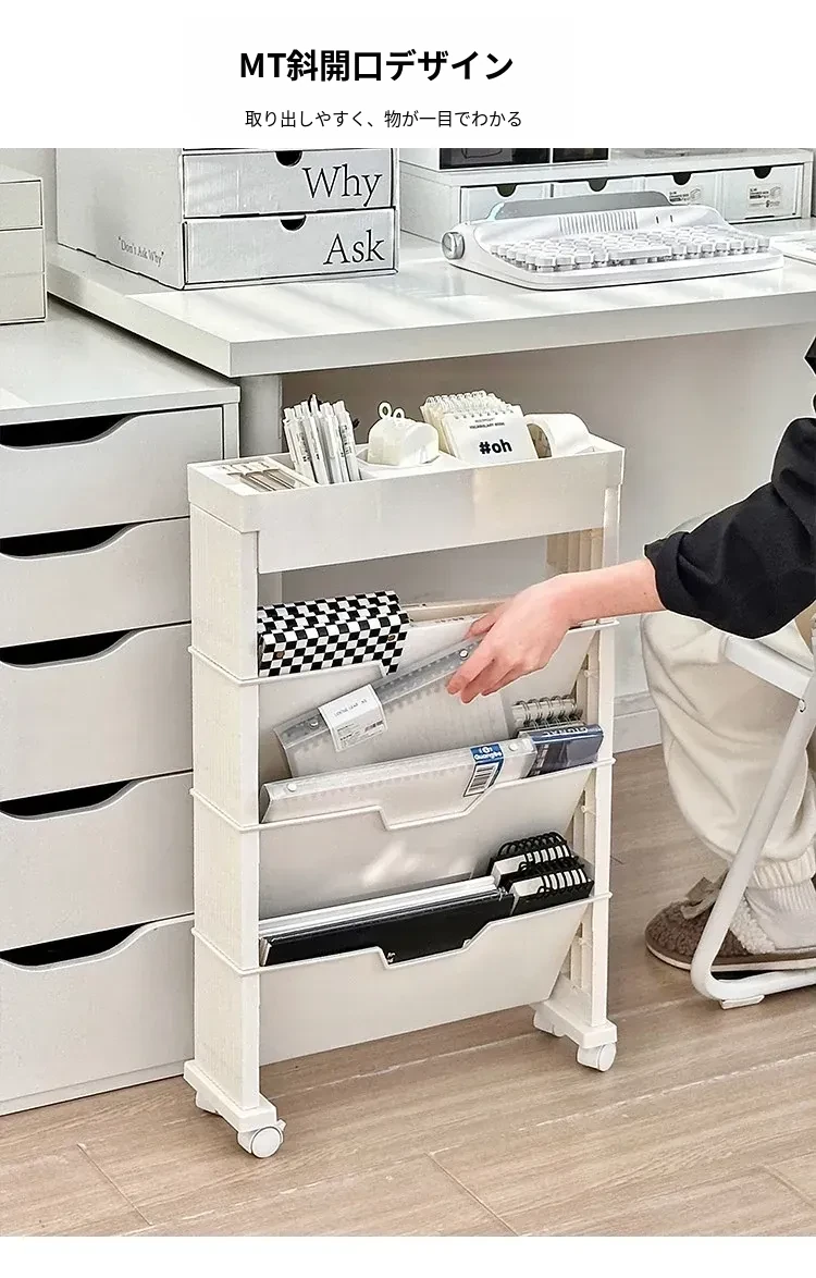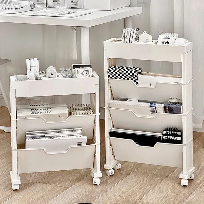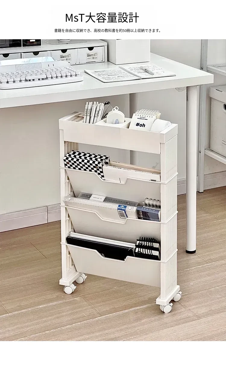 キャスター付き移動式収納ラック - 学生寮や教室に最適な本や小物の整理整頓に役立つ便利なアイテム!デスクの横にぴったりフィットし、スペースを有効活用します。