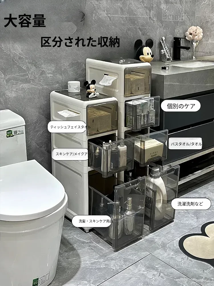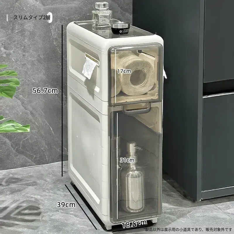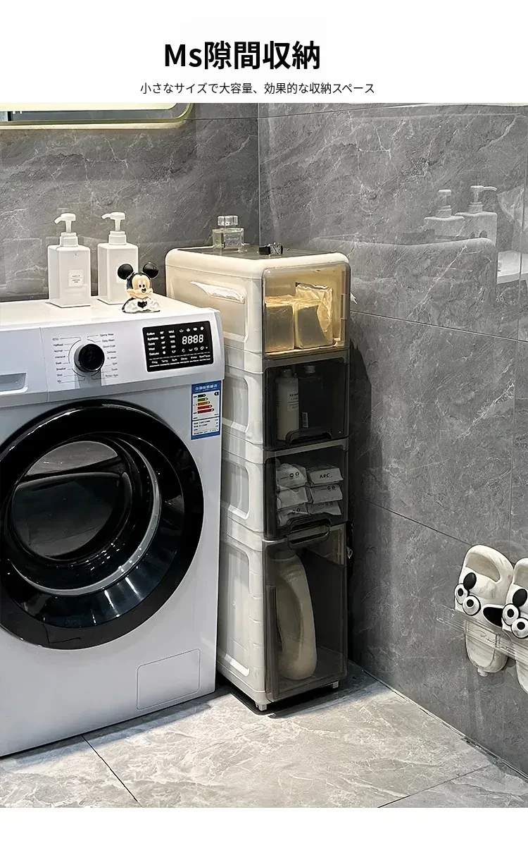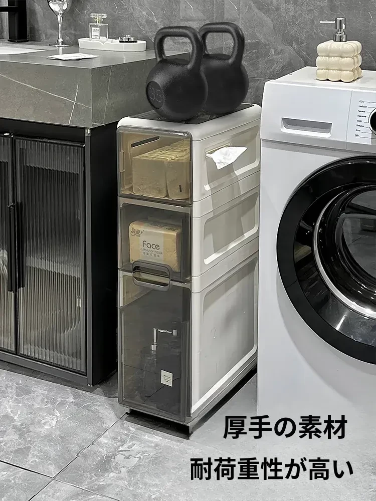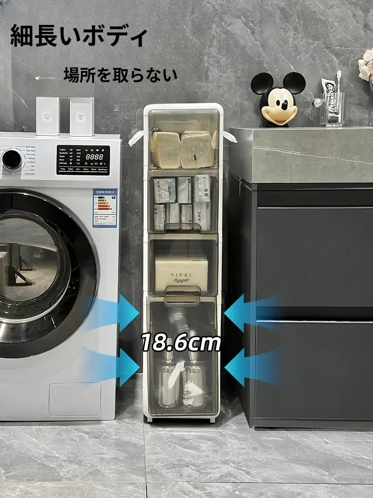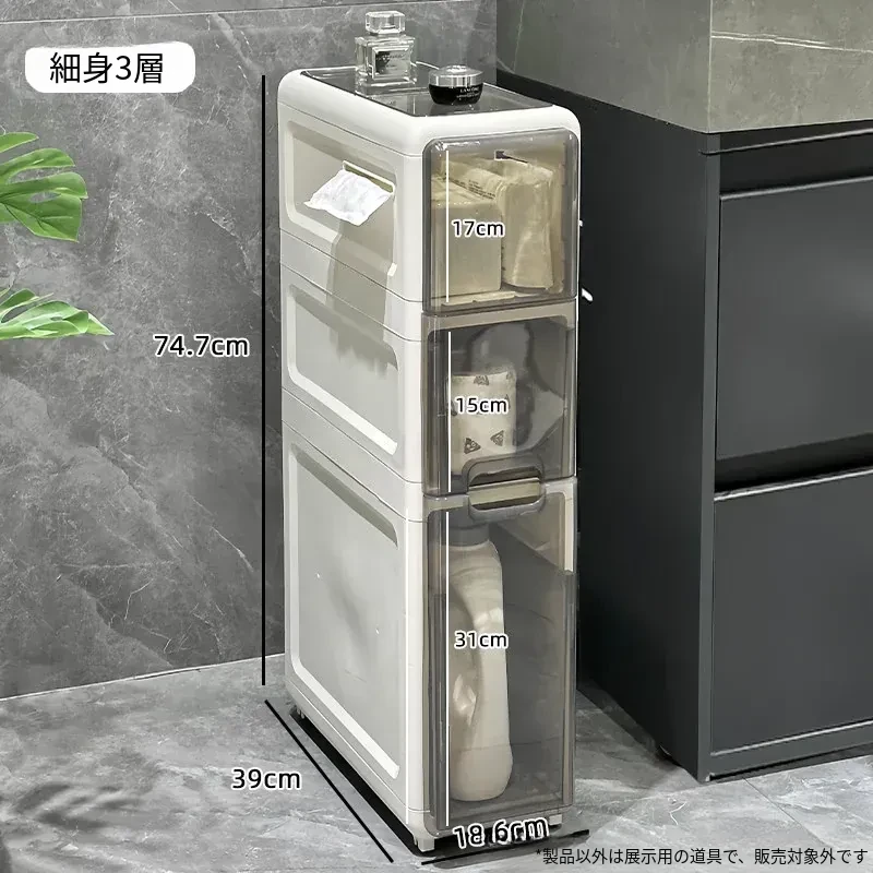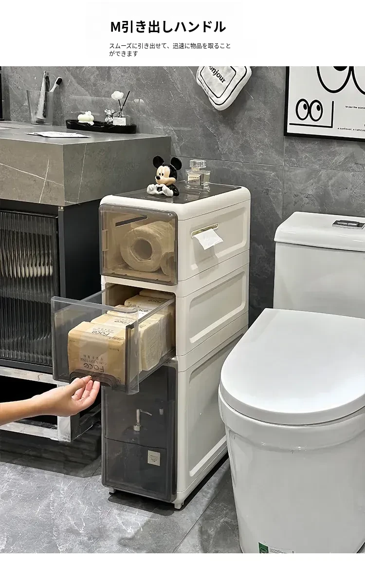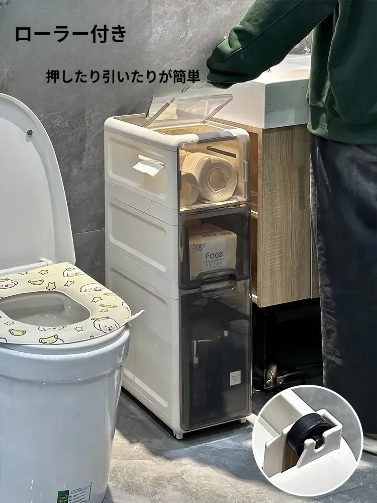 隙間収納キャビネット - バスルームやトイレにぴったりのスリムな収納!トイレ横のスペースを有効活用し、引き出し式で整理整頓も簡単。狭い場所でもおしゃれに使える収納力満点のアイテムです!
