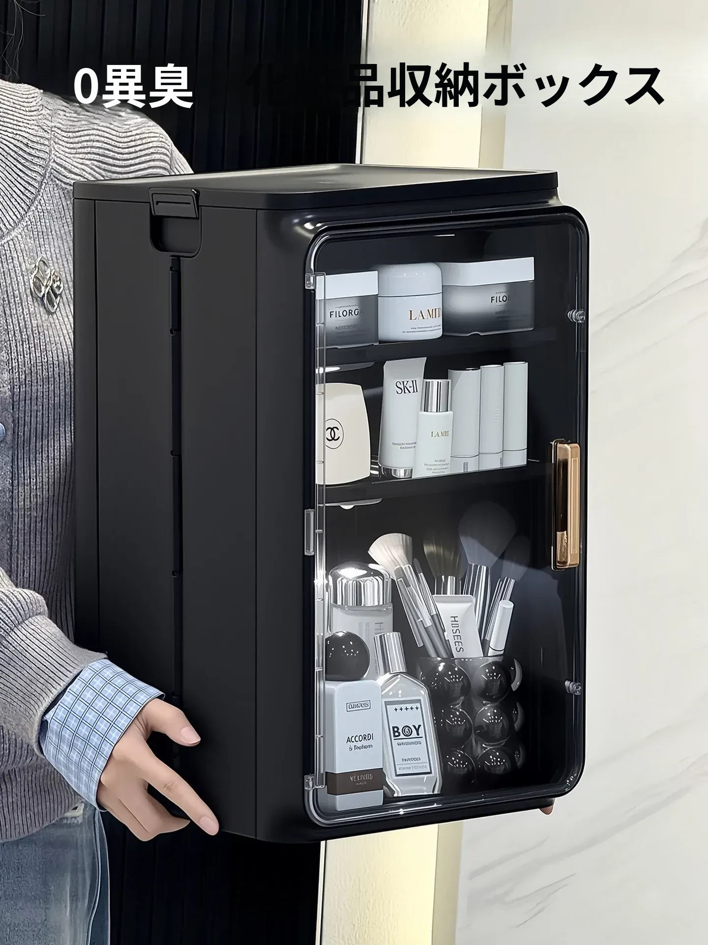 デスク用化粧品収納ボックス - おしゃれな洗面台用整理ラック!スキンケアやフェイスマスクをきれいに整頓し、ホコリから守ります。すっきりとした空間を作り出し、毎日の美容ルーティンをもっと楽しもう!