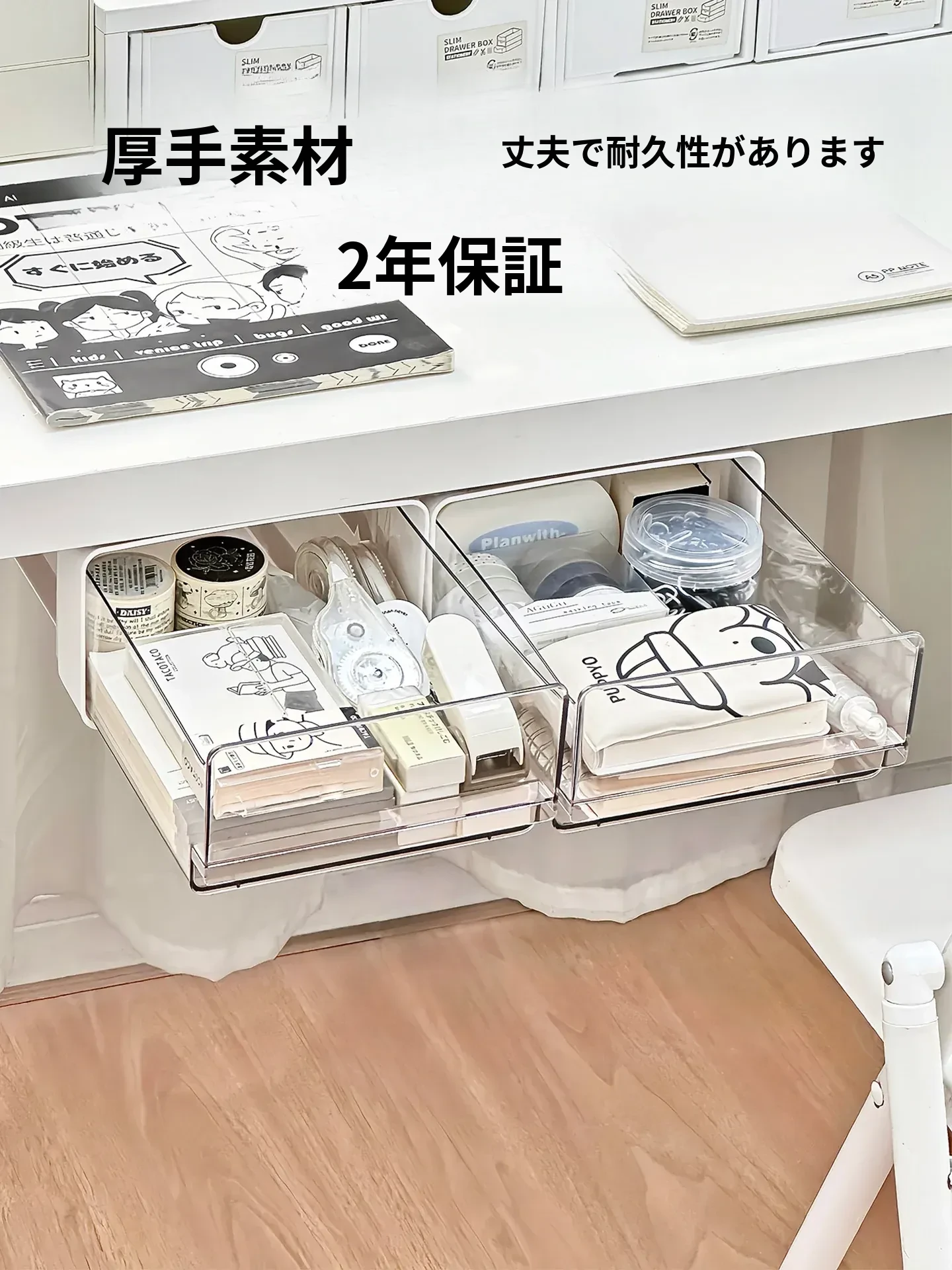 穴あけ不要の大容量デスク下引き出し収納ボックス!文具や本をスッキリ整理できる便利アイテム。オフィスのデスクを美しく保ちながら、使いやすさ抜群!