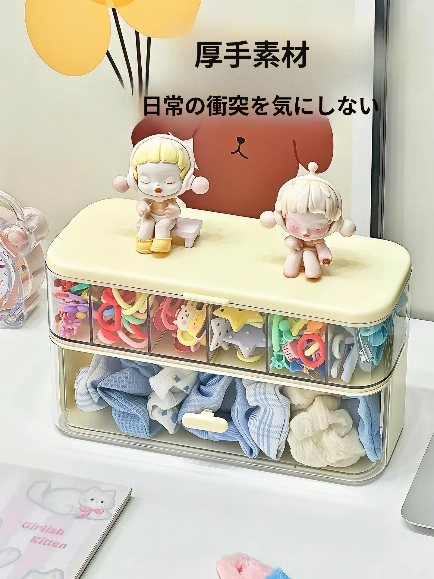 子供用ヘアアクセサリー収納ボックス - デスクトップで使えるヘアゴム・ヘアクリップ・大きめのヘアゴムを整理できる二層式仕切り付き!小さなクリップもスッキリ収納、おしゃれなデザインでお部屋も可愛く!