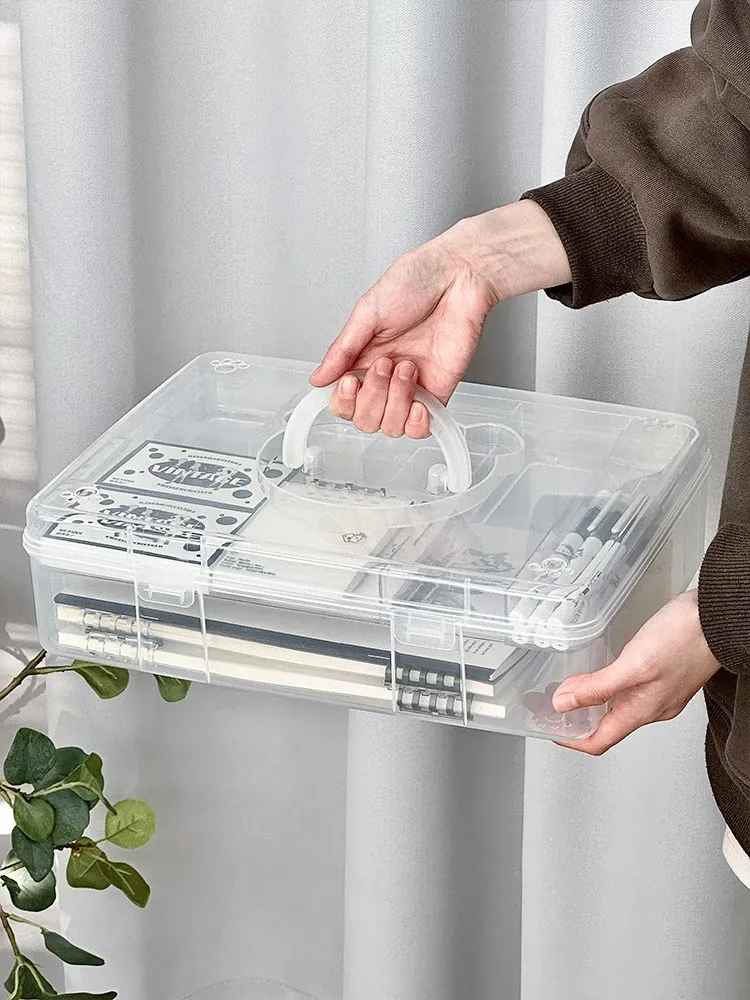 大容量!学生必备手提書籍収納ボックス - 教室やデスク用の二層仕切りで整理整頓!プラスチック製で軽量、持ち運びも簡単!