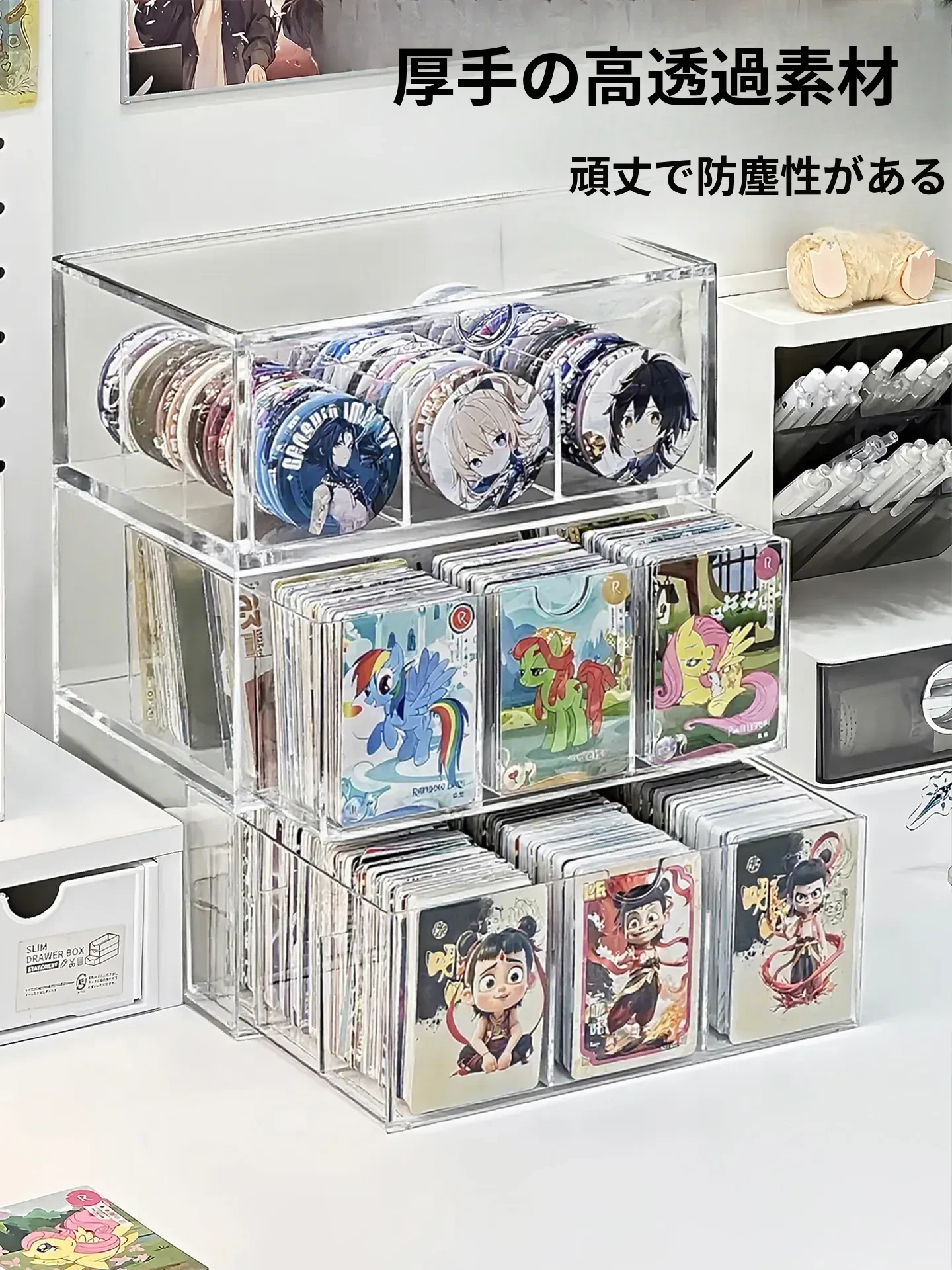 アクリル製デスクトップ収納ボックス - 大容量のフィギュア&カード整理ボックス!ホコリ防止と仕切り付きで、ポニーやネザのキャラクターを鮮やかにディスプレイ!あなたのコレクションを美しく保ちましょう!