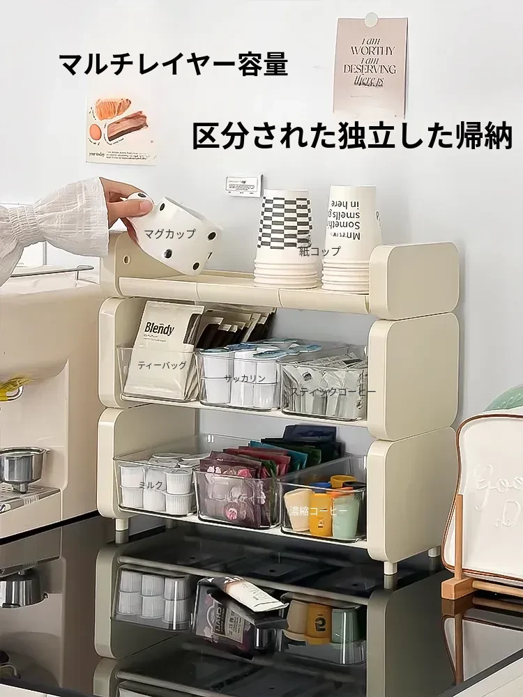 おしゃれな多層ティーバッグ収納ボックス - デスク上にぴったりなコーヒー・茶葉・カップ収納ラック!ダイニングテーブルやサイドボードに最適な実用的な収納ソリューション。