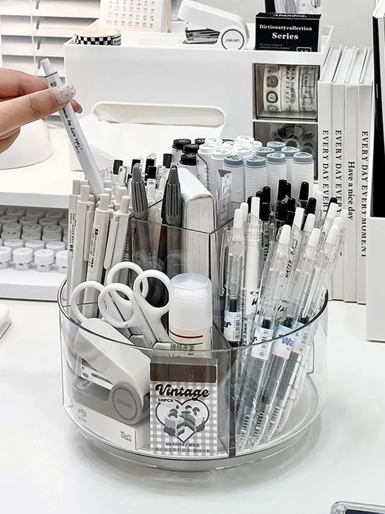 回転式アクリルペンスタンド – おしゃれなデスク用文具収納ボックス!オフィスや書斎にぴったりな透明仕切り付きペンバケツで、整理整頓を楽しみましょう。高級感あふれるデザインで、あなたの作業スペースをより魅力的に演出します!