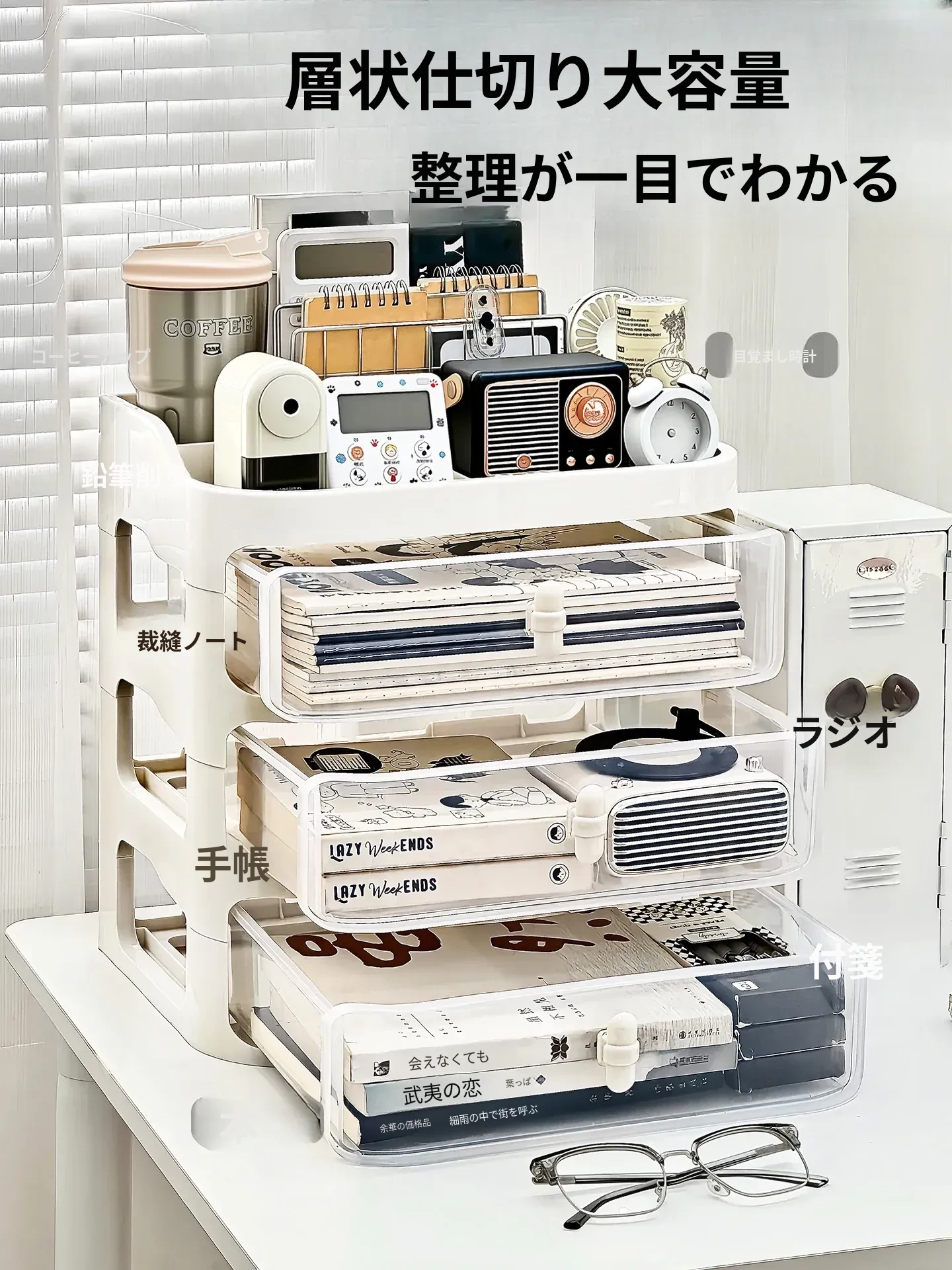 デスク用引き出し式文具収納ボックス - 透明デザインで小物をスッキリ整理!オフィスや勉強に最適な分別収納ラック。机上を美しく保つおしゃれなアイテム!