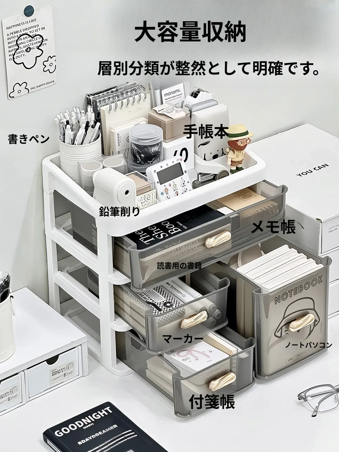 デスク上の整理整頓に最適!大容量の文房具収納ボックス - 書籍や雑貨、おやつもスッキリ整理できる仕切り付きラック!シンプルでスタイリッシュなデザインで、あなたのデスクを美しく保ちます。