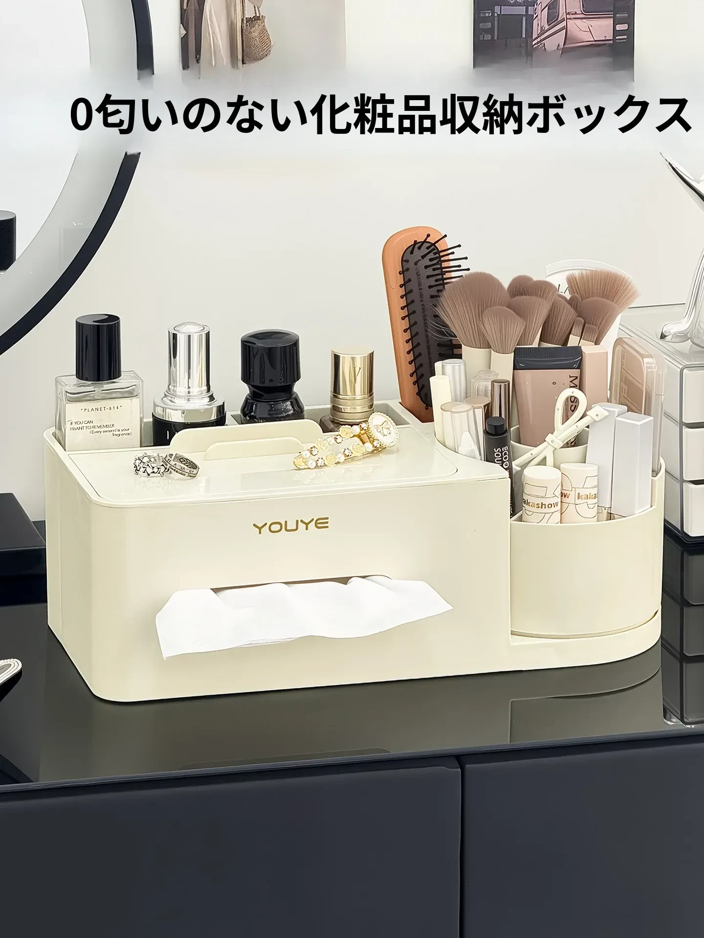 高級感溢れる化粧品収納ボックス - スキンケアアイテムやメイク道具を整理整頓!卓上スペースを有効活用し、美しいドレッサーを実現する仕分け収納ケースです。口紅やフェイスマスクもすっきり収納!