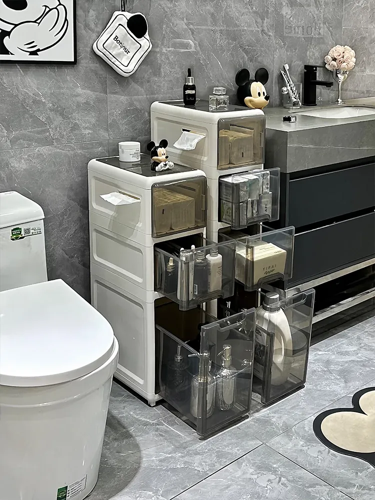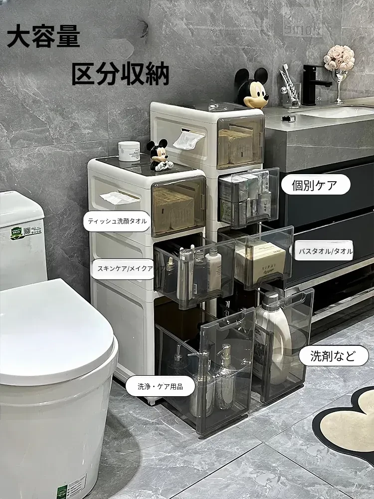 隙間収納キャビネット - バスルームやトイレにぴったりのスリムな収納!トイレ横のスペースを有効活用し、引き出し式で整理整頓も簡単。狭い場所でもおしゃれに使える収納力満点のアイテムです!
